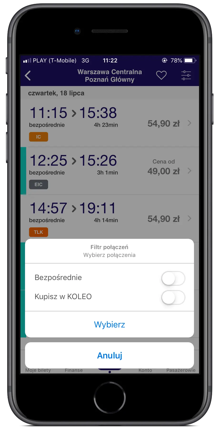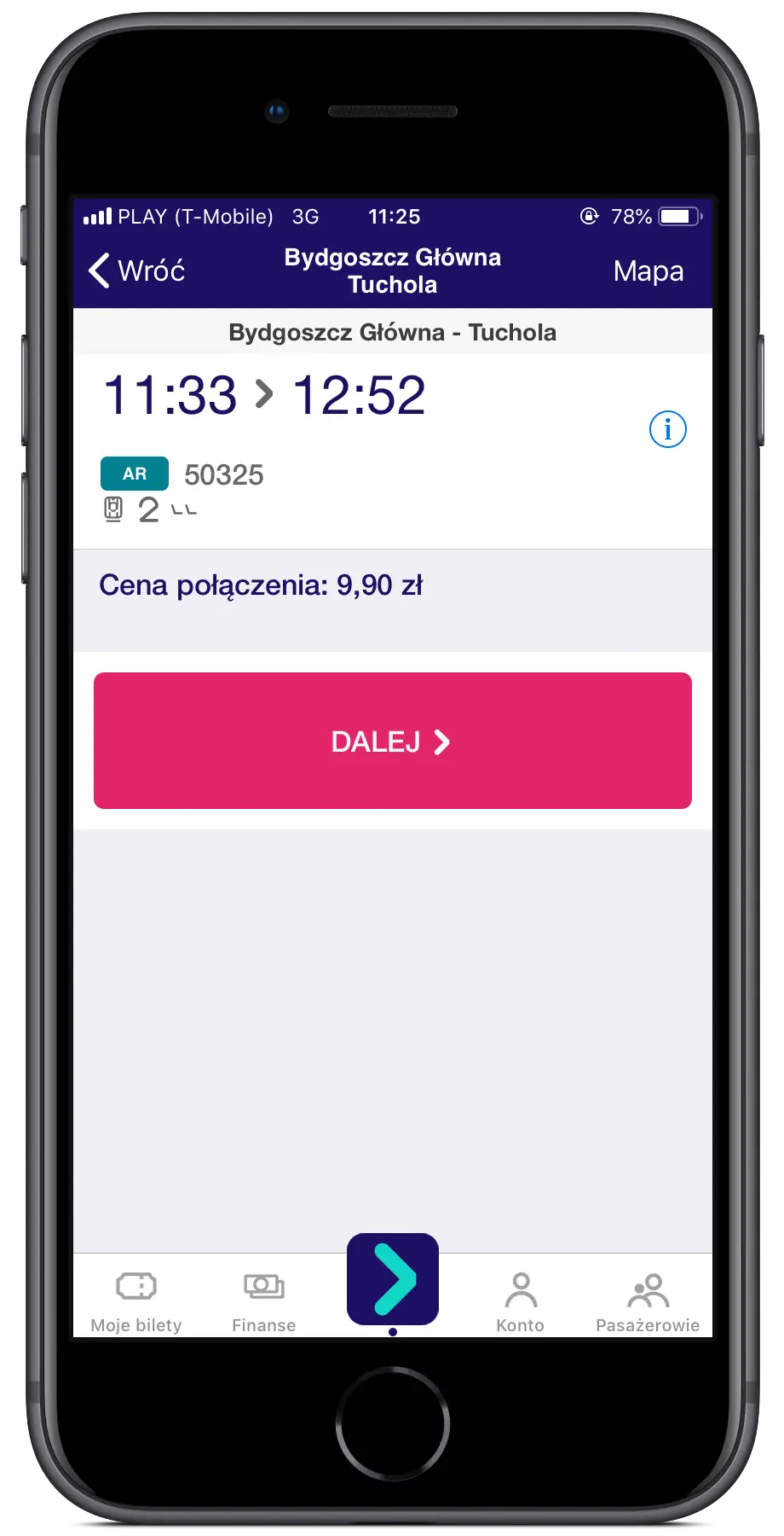 Jak możecie zobaczyć po zrzutach ekranu – nie jestem zalogowanym użytkownikiem. Dlaczego? Swoje bilety trzymam na stronie internetowej przewoźnika, ponieważ robię to od dawna i jestem do tego przyzwyczajony. Następnym powodem jest ich brak sprzedaży przez KOLEO na wszystkich liniach – najczęściej kupimy bilety regionalne, tak jak na przykładzie niżej, z Bydgoszczy do Tucholi. Nie zrobimy tego na dłuższych dystansach (jak relacja Warszawa-Poznań), co może boleć niektórych użytkowników – takich jak ja.