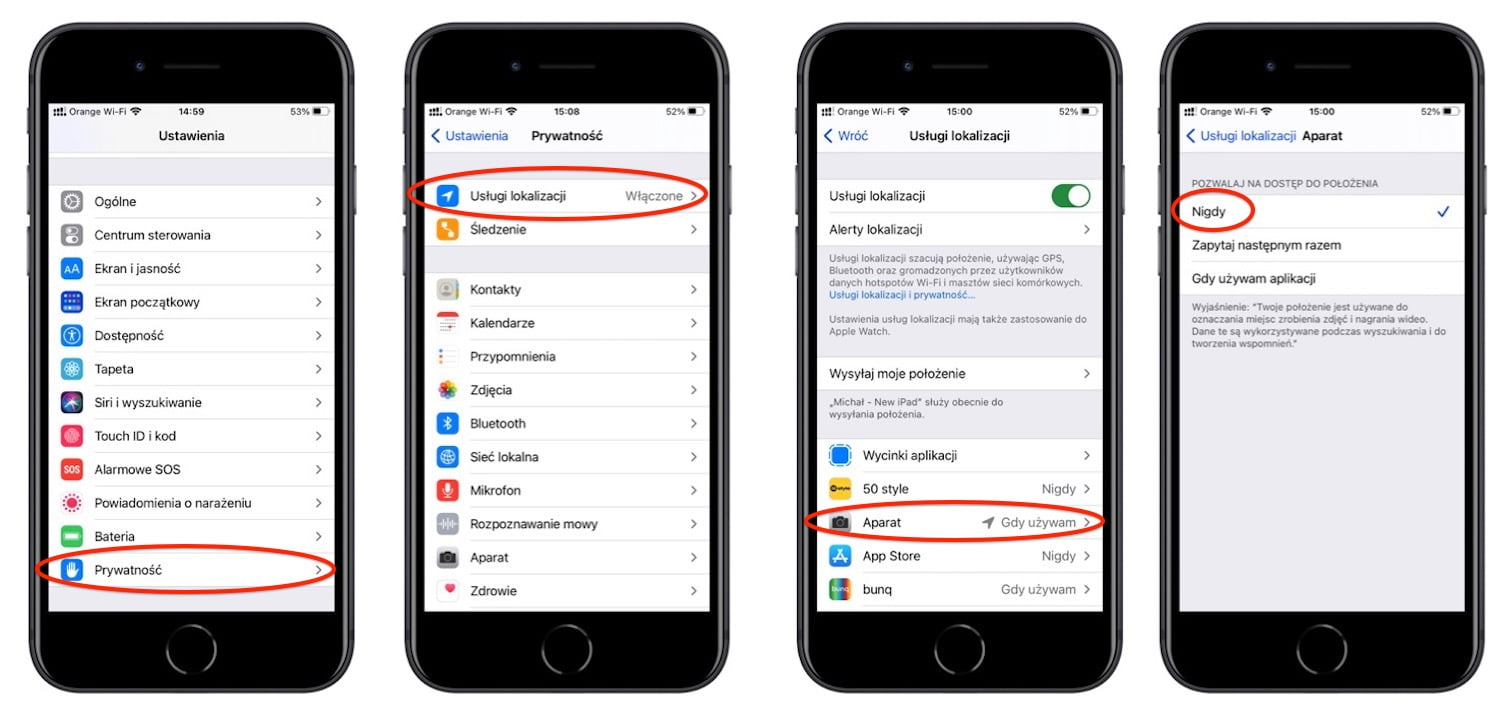Uruchom aplikację Ustawienia i wybierz Prywatność. Następnie wybierz Usługi lokalizacji. Na liście aplikacji znajdź i kliknij w Aparat. Wybierz opcję Nigdy jeśli chcesz wyłączyć na stałe dodawania lokalizacji do zdjęć. Możesz też wybrać Zapytaj następnym razem. Wtedy, po każdym uruchomieniu aparatu system zapyta, czy chcesz dodać lokalizację do zdjęć.