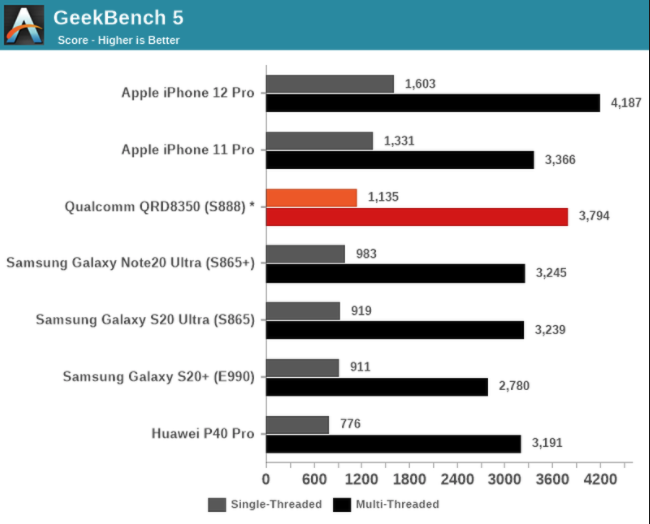 Jak się okazuje, najnowszy procesor firmy Qualcomm, czyli Snapdragon 888 przegrywa w testach porównawczych z największym konkurentem, czyli układem A14 od firmy Apple. Chip Snapdragon 888 uzyskał wynik dla jednordzeniowego 1135 i wielordzeniowy wynik 3794, podczas gdy iPhone 12 Pro z chipem A14 uzyskał wynik jednordzeniowy wynoszący 1603 i wynik dla wielu rdzeni 4187.
