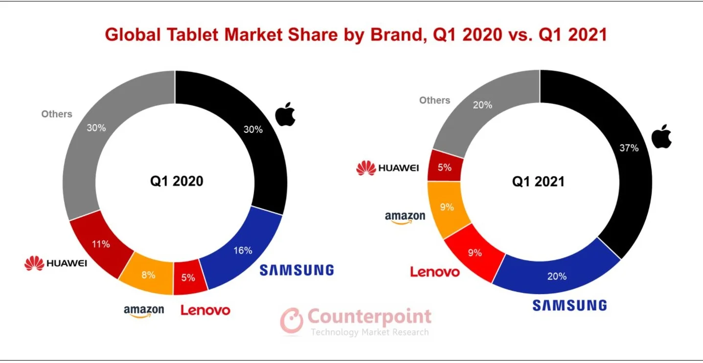 Analitycy z firmy Counterpoint udostępnili raport na temat sprzedaży tabletów w pierwszym kwartale 2021 roku. Na pierwszym miejscu jest firma Apple. Uzyskała ona udział na nim na poziomie 37 %. Jest to wzrost rok do roku o 7 %. Drugie miejsce zajęła firma Samsung z 20 % udziałem na rynku i wzrostem o 4 %. Trzecie miejsce należy do firm Amazon oraz Lenovo. Jedna i druga firma osiągnęły po 8 % udział na rynku. Czwarte miejsce zajęła firma Huawei z 5 % udziałem na rynku. Inni producenci zostali dodani do wspólnej grupy nazwanej „pozostali”. W okresie między styczniem a marcem 56 % wszystkich sprzedanych iPadów stanowiły modele mini oraz budżetowe. W przypadku modelów Air oraz Pro jest to odpowiednio 19 % i 18 %.