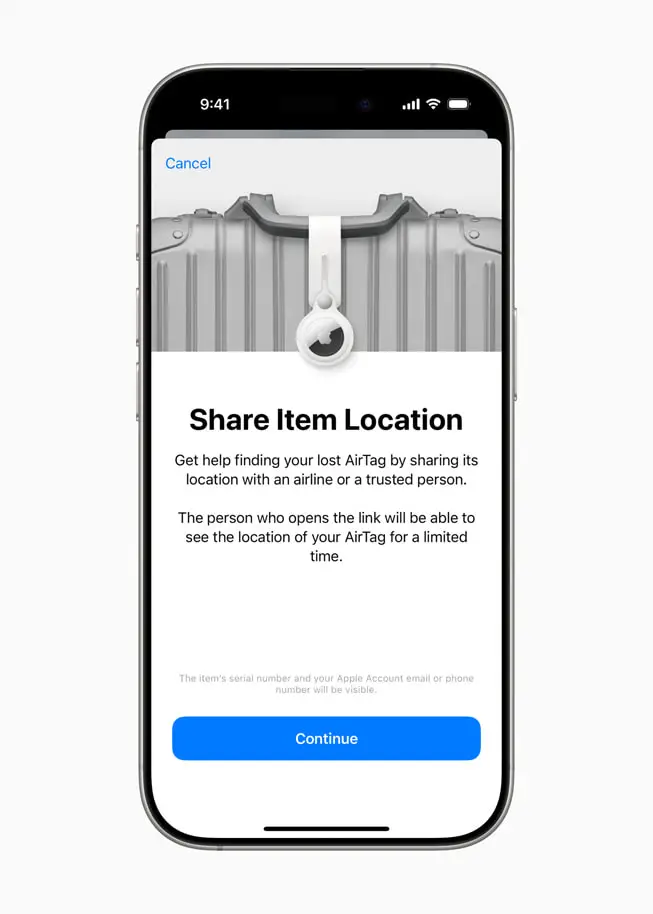 Firma Apple przedstawiła debiutującą w iOS funkcję Share Item Location, która pomaga użytkownikom zlokalizować i odzyskać zgubione przedmioty, ponieważ pozwala na przekazanie lokalizacji AirTaga lub akcesorium z sieci usługi Znajdź innym osobom, w tym pracownikom linii lotniczych.