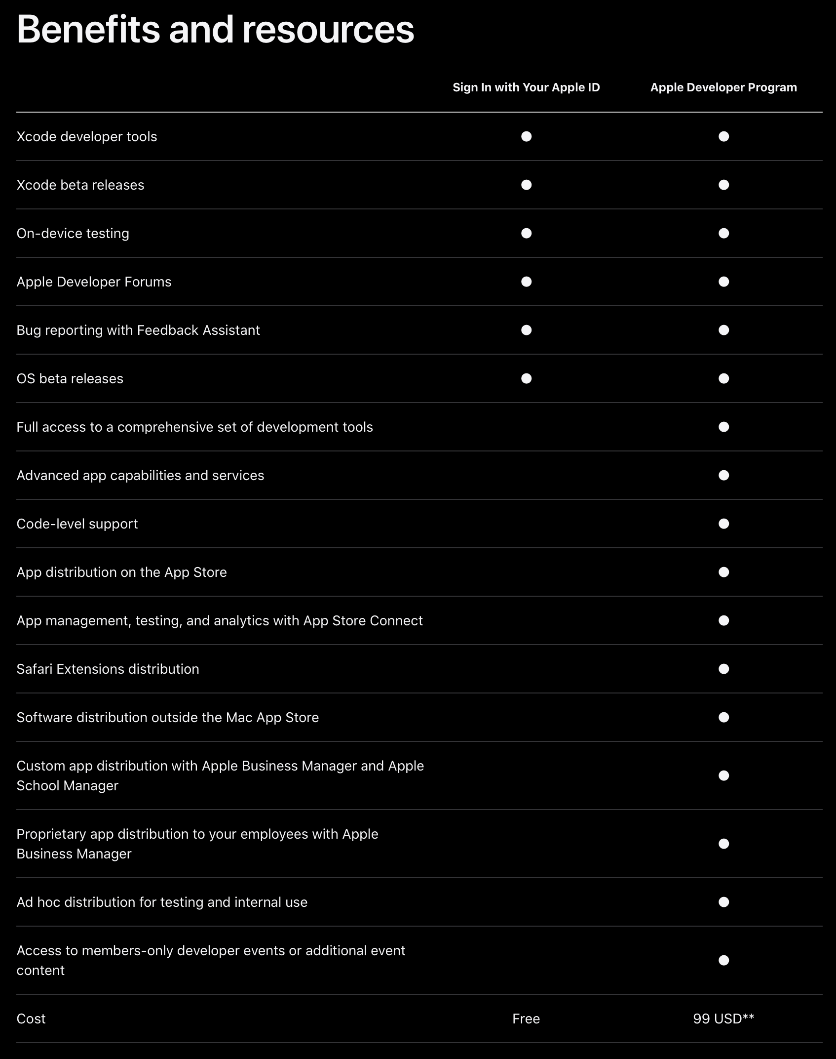 Oto spojrzenie na różnice między programem Apple Developer Program za 99 USD rocznie a samym korzystaniem z Apple ID: