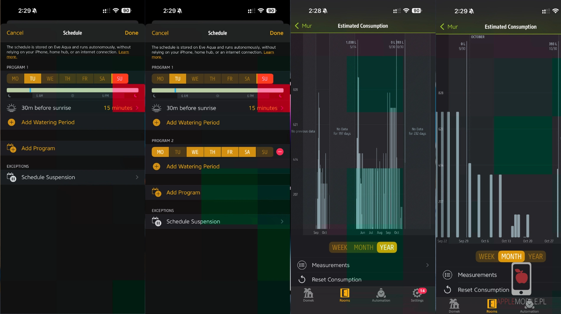 Możliwości, jakie daje zarządzanie Eve Aqua z poziomu aplikacji, są imponujące. Nie tylko ustawiasz harmonogramy, ale też masz pełny wgląd w historię podlewania i szacowane zużycie wody – wszystko z poziomu czytelnych wykresów i raportów.