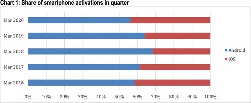 Analitycy z Consumer Research Intelligence Partners opublikowali raport na temat aktywacji smartfonów w USA w 1 kwartale 2020 roku. Badanie zostało przeprowadzone na 500 osobach w okresie między 1 a 9 kwietnia. Według ich w okresie pomiędzy styczniem a marcem iPhone’y stanowiły 44 % wszystkich aktywowanych smartfonów. Pozostałe 56 % to smartfony z systemem Android. Wynik z 1 kwartału 2020 roku jest najlepszym jaki został odnotowany od ostatnich 4 lat. 91 % wszystkich zakupionych iPhone’ów zakupiły osoby, które wcześniej korzystały z telefonów od Apple. Wynik urządzeń z systemem Android jest na poziomie 88 %.