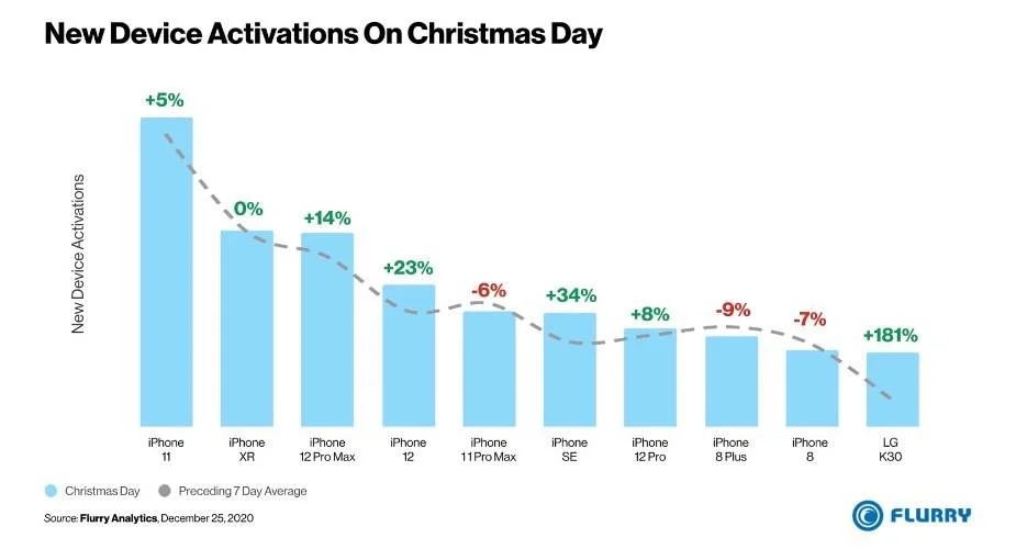 Analitycy z firmy Flurry Analytics udostępnili raport na temat aktywacji smartfonów w USA podczas 25 grudnia 2020 roku. Firma Apple swoimi smartfonami zdominowała to zestawienie. Dziewięć modeli iPhone’a znalazło się na liście dziesięciu najbardziej popularnych smartfonów. Analitycy poinformowali, że pandemia miała jednak ogromne znaczenie w kwestii zakupów nowych smartfonów. Porównując analogiczny okres w 2019 roku, liczba aktywowanych smartfonów spadła o 23 %. Analiza jest oparta na danych, które są pozyskiwane z aplikacji z ponad 2 miliardów smartfonów miesięcznie.