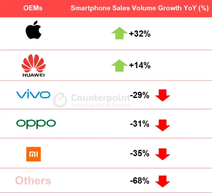 Analitycy z firmy Counterpoint Research opublikowali raport na temat sprzedaży smartfonów w 2 kwartale tego roku w Chinach. Według nich firma Apple od kwietnia do czerwca sprzedała w Chinach ponad 7,4 miliona iPhone’ów. W porównaniu z poprzednim rokiem w tym samym okresie jest to wzrost o 32 %. Wynik taki zostały uzyskany dzięki bardzo dobre sprzedaży iPhone’a SE oraz iPhone’a 11. Firma Huawei dla porównania uzyskała wzrost sprzedaży na poziomie 14 %, ale w czasie tych 3 miesięcy sprzedała ponad 36,6 miliona smartfonów. Pozostali producenci zanotowali bardzo duży spadek sprzedaży, który osiągnął nawet 35 %. Są to takie firmy jak Vivo, Xiaomi i Oppo.
