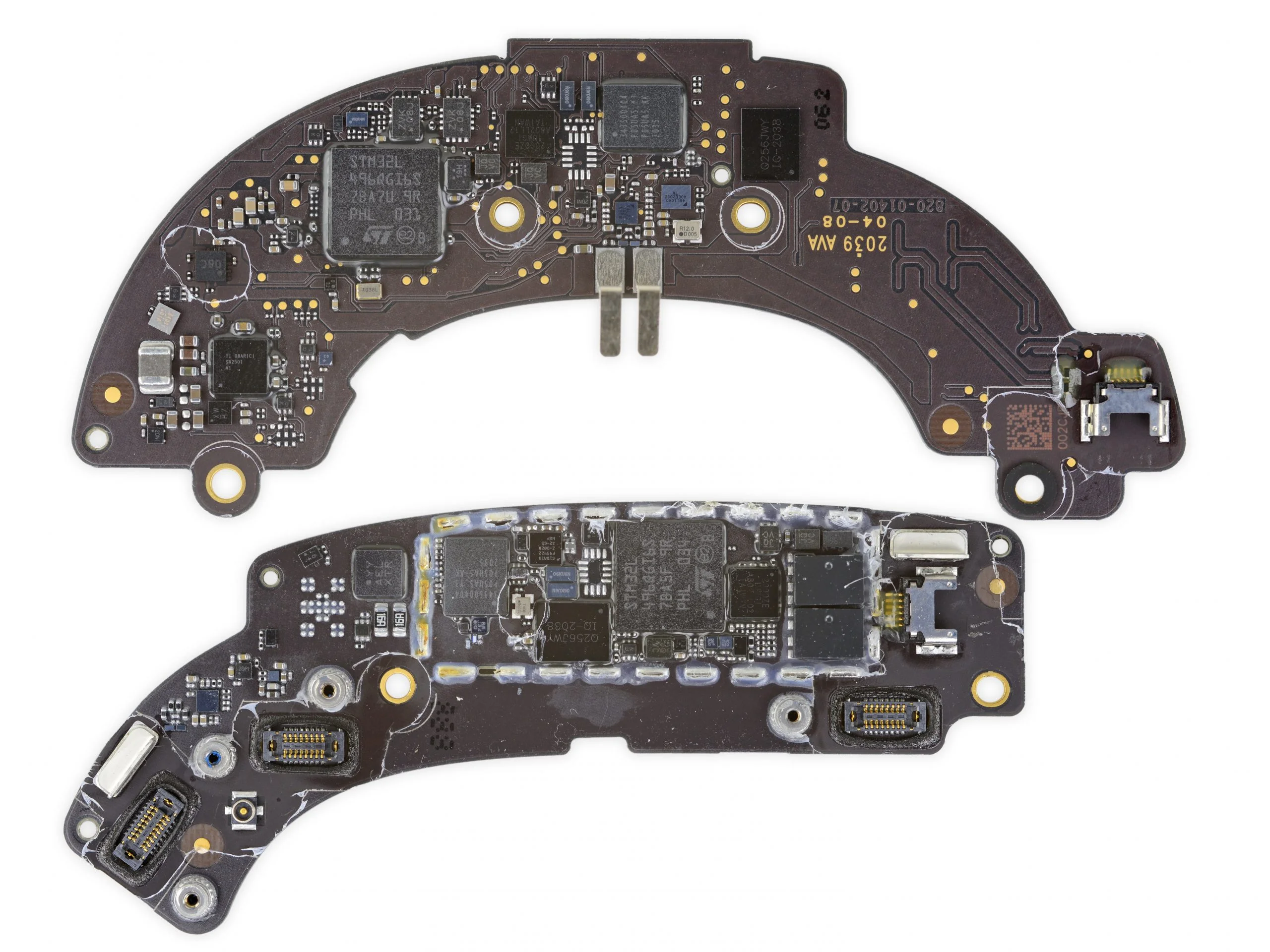 Redaktorzy z serwisu iFixit rozebrali słuchawki AirPods Max. Jednak jest to na razie pierwsza część, gdyż na całkowitą rozbiórkę potrzeba więcej czasu. Jest to spowodowane bardzo wymagającą konstrukcją tych słuchawek. Posiadają one dwa 40 mm przetworniki, magnetyczne nauszniki, 8 mikrofonów dla ANC i 2 czipy H1 po jednym na każdą słuchawkę. Na zdjęciach rentgenowskich wykonanych przez Creative Electron można zobaczyć, że firma Apple dodała 2 akumulatory, które są umieszczone w jednym nauszniku. Zostały one przylutowane, a dookoła nich jest pełno przewodów. W obu słuchawkach są płyty główne z dużą ilością czipów i różnego rodzaju modułów. „Głośniki” są zamocowane do całej konstrukcji przy pomocy kleju oraz śrub. Pracownicy zapowiadają, że w ciągu kilku najbliższych dni zostaną przekazane bardziej szczegółowe dane na temat tych słuchawek. Bardzo prawdopodobne, że ich ocena pod względem potencjalnej naprawy będzie dość niska.