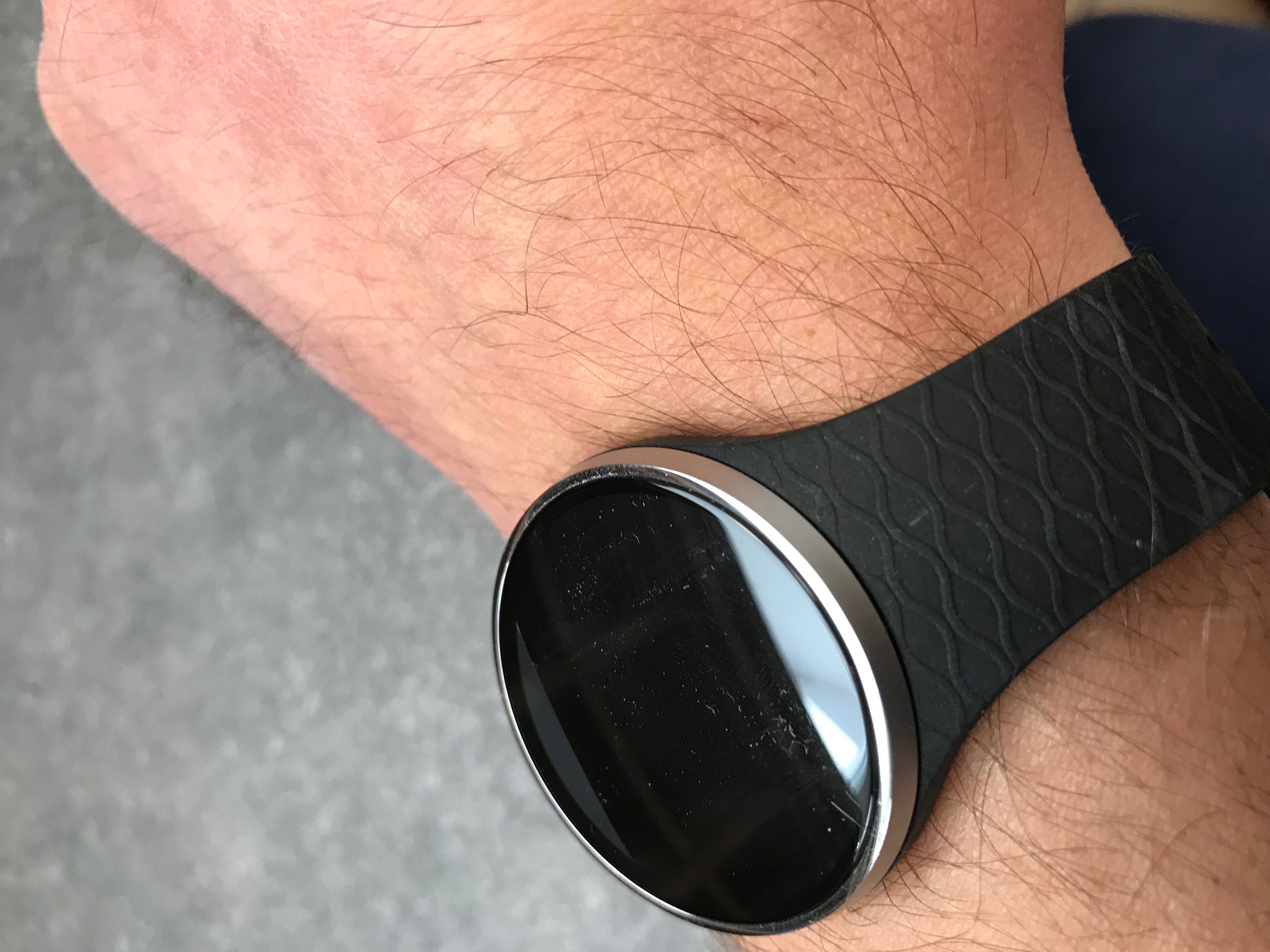 Gumowe paski (jak pisałem w zestawie znajdują się dwa) posiadają od wewnętrznej strony specjalne wyżłobienie, które spełnia rolę wentylacyjną i zapobiega, przynajmniej w teorii, poceniu się skóry. Niestety praktyka szybko weryfikuje powyższe na niekorzyść zestawu. Koperta zamknięta jest od góry monochromatycznym, dotykowym (bez wsparcia dla technologii multitouch) ekranem LCD wyświetlającym podstawowe informacje z wiązane z aktywnością użytkownika.
