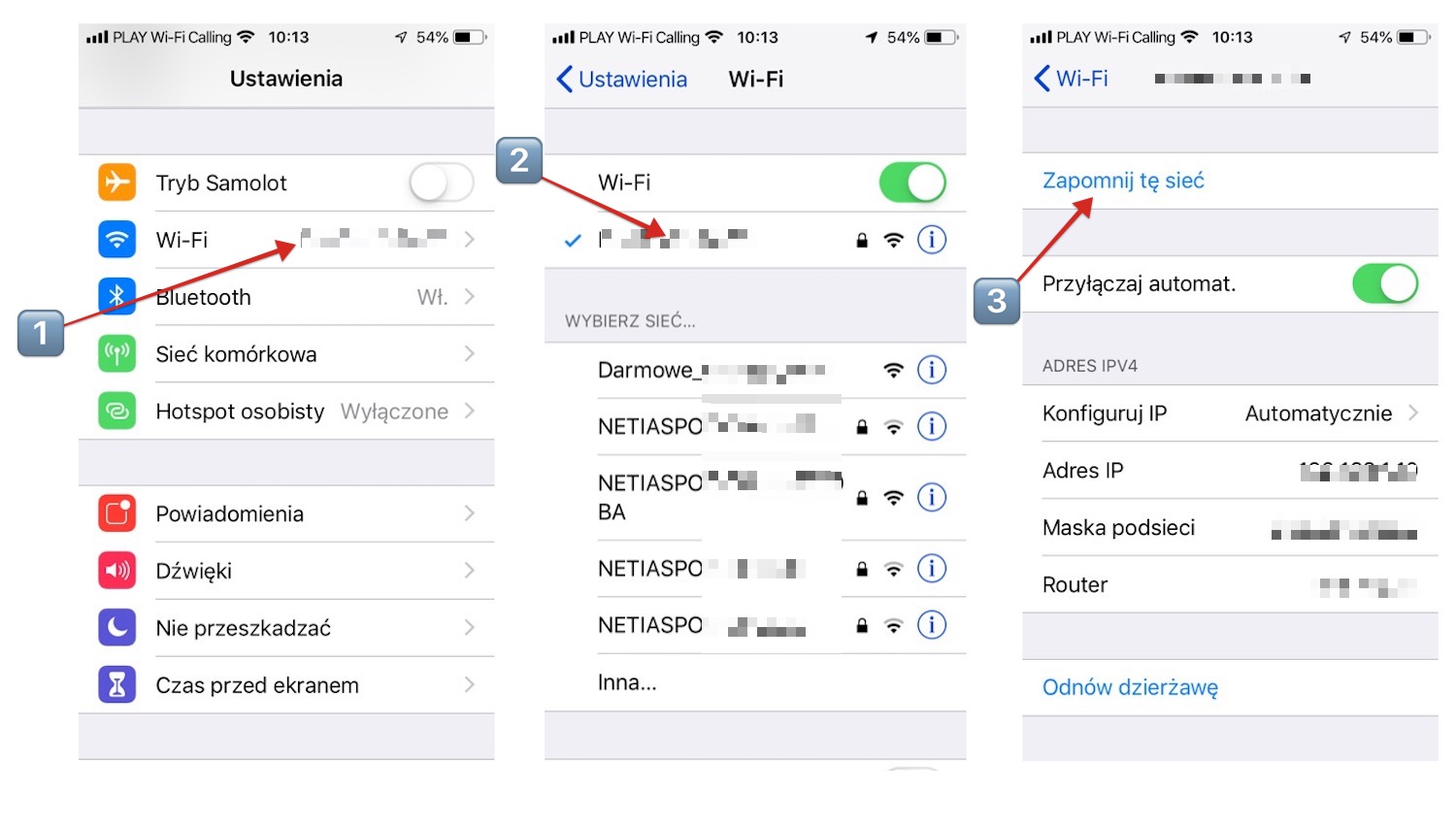 iUrządzenie: uruchom aplikację Ustawienia, następnie wybierz Wi-Fi (1) > sieć (2) > Zapomnij tę sieć (3)