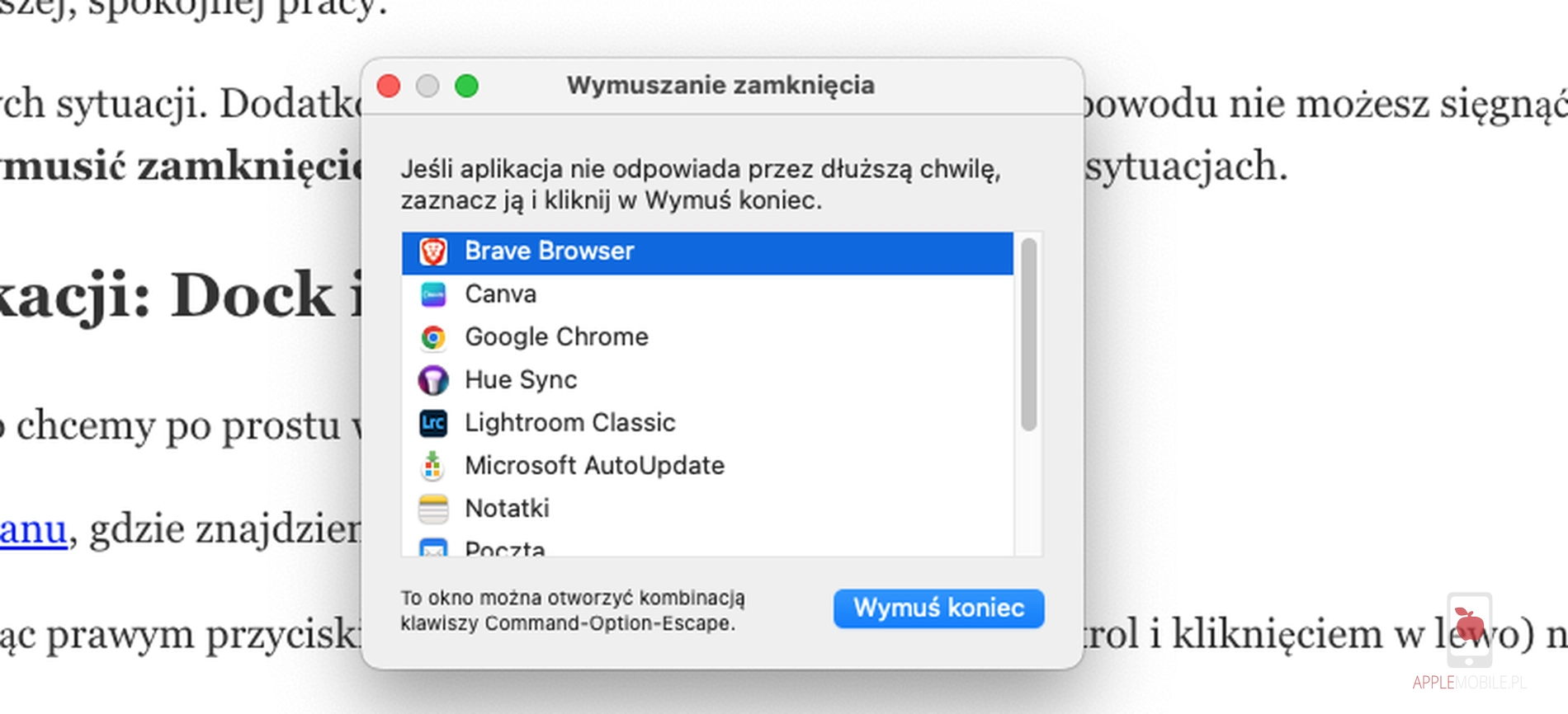 - Aby wymusić zamknięcie aplikacji, możemy użyć skrótu klawiszowego Command + Option + Esc.