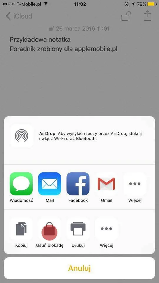 Powiedźmy, że dana notatka nie jest już dla nas tajemnicą i chcemy nią dzielić się z innymi, dlatego też nie chcemy dłużej zabezpieczać jej hasłem. należy otworzyć notatkę, nacisnąć przycisk „udostępnij” i z dołu listy wybrać „usuń blokadę”. Tylko w ten sposób blokada zostanie usunięta. Nie ma już więcej potrzeby, aby wprowadzać hasło.