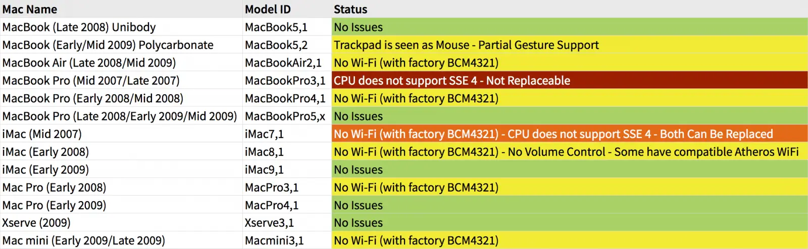 Poniżej znajduje się tabela, w której są zawarte wszystkie informacje (również te odnośnie działania Wi-Fi) z jakimi modelami komputerów Mac system macOS Sierra będzie współpracował poprawnie, a z którymi nie do końca lub w cale.