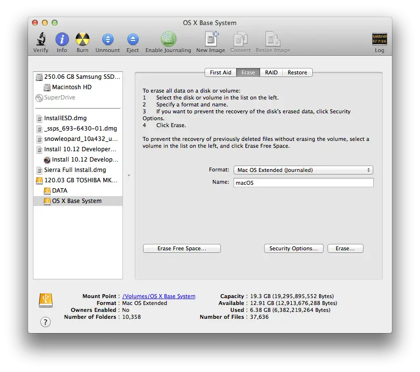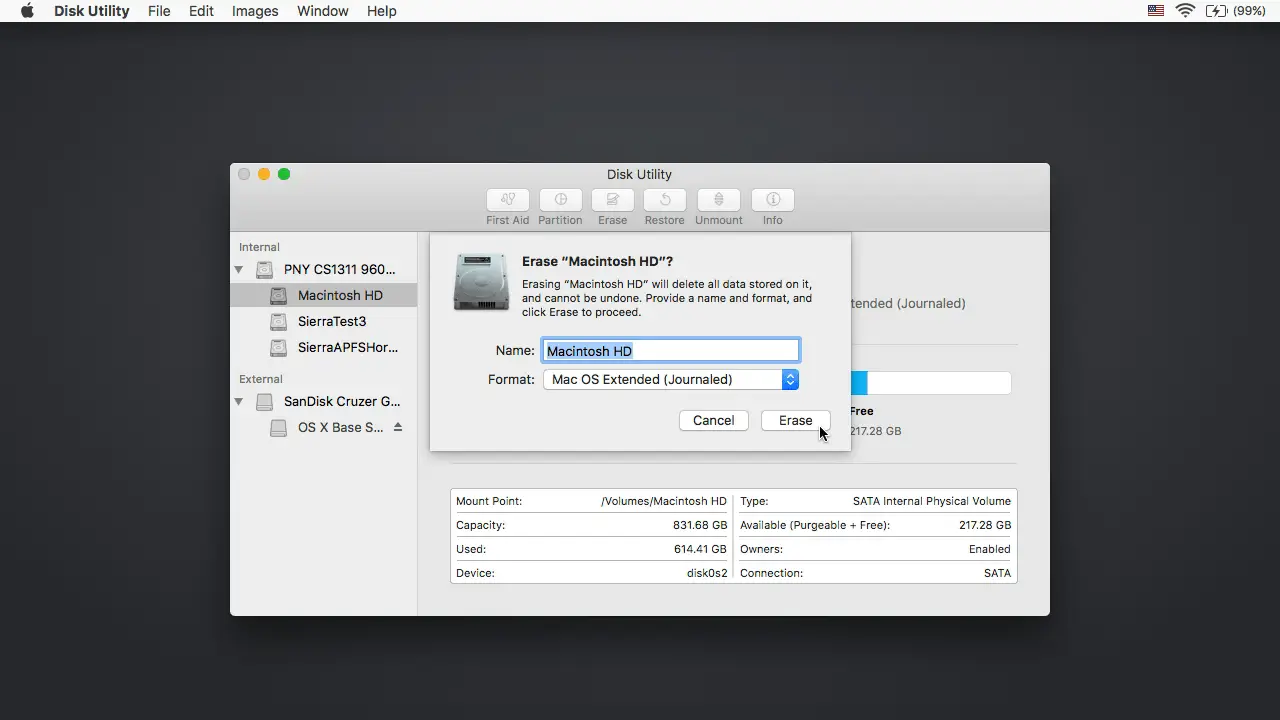 - Wybierz dysk lub partycję, na której chcesz zainstalować system i usuną ją, wybierając użycie Mac OS Extended (Journaled) jako typ systemu plików. Jeśli formatujesz cały dysk, upewnij się czy jest wybrana opcja GUID.