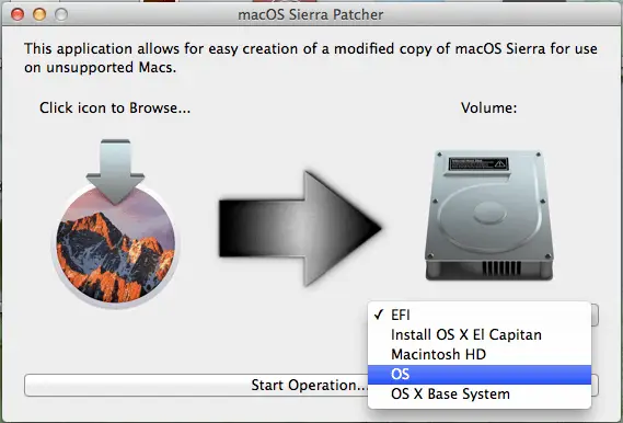 - Uruchamo program „macOS Sierra Patcher” i wybierz plik instalacyjny macOS Sierra. Czekaj na powodzenie w weryfikacji oprogramowania