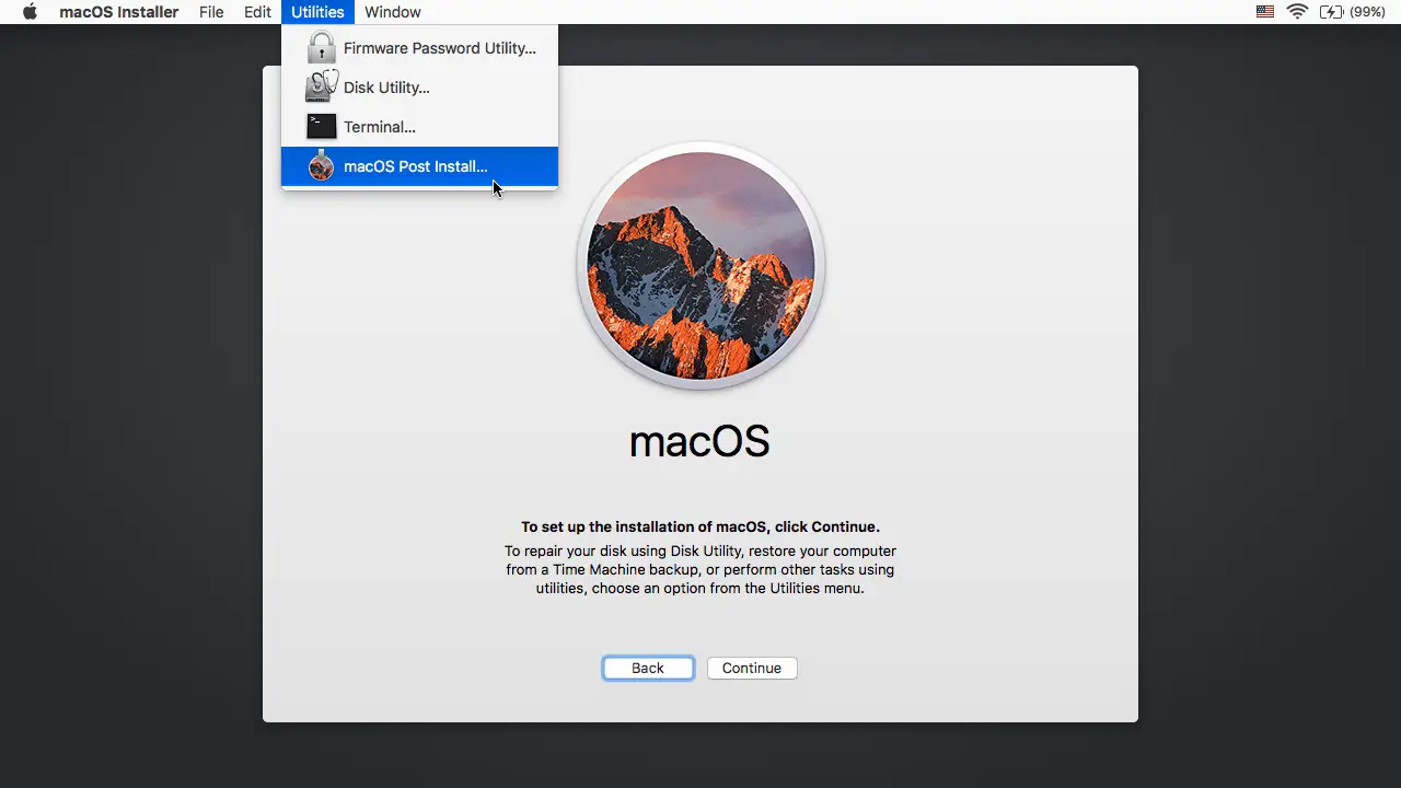 - Po zakończeniu instalacji uruchom ponownie z powrotem z dysku instalatora. Tym razem, otwórz „macOS Post Install”.