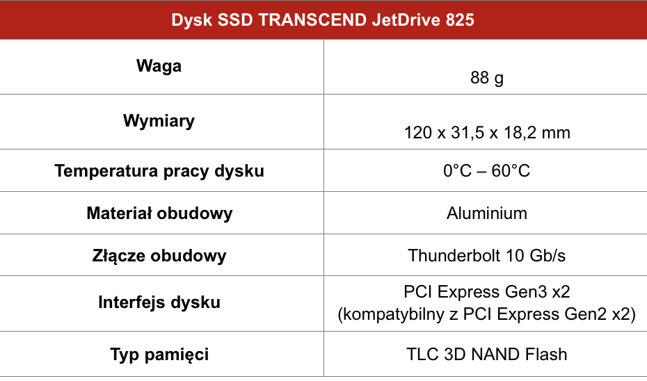 JetDrive 825 charakteryzuje się aluminiową obudową, która dobrze komponuje się ze stylistyką urządzeń Apple. Dysk komunikuje się z komputerem poprzez szybki interfejs Thunderbolt 10 Gb/s i umożliwia zwiększenie fabrycznej przestrzeni dyskowej nawet o 960 GB (dostępne są również warianty dysku o pojemności 480 GB oraz 240 GB).