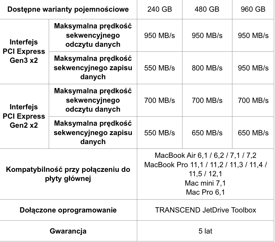 Przy takim rozwiązaniu, wymieniony fabryczny dysk można z powodzeniem przełożyć do obudowy JetDrive 825, zachowując jego funkcjonalność. Wśród wspieranych komputerów znajdują się: MacBooki Pro Retina 13” i 15” (2013 – 2015), MacBooki Air 11” i 13” (2013 – 2017), Maki mini (2014) oraz Maki Pro (2013).