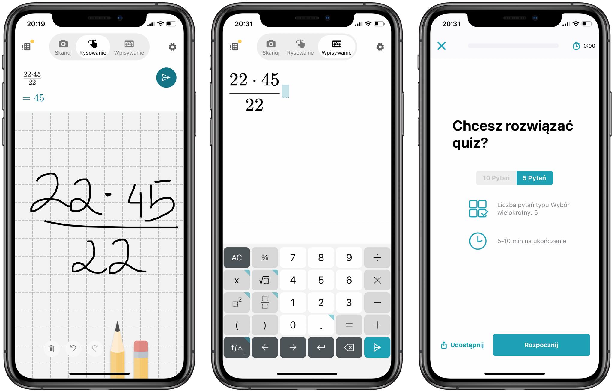 Możemy korzystać z typowego kalkulatora, z formy aparatu (czyli robienie zdjęć – dokładnie tak, jak w Photomath, o którym również mogliście przeczytać na applemobile.pl w „aplikacji tygodnia”), a także z funkcji rysowania. To świetna rzecz, gdyż wystarczy nabazgrolić to, co chcecie obliczyć, i już! Gotowe. Możecie także dodać ważne dla Was działania do zakładek, aby nie zgubić ich i wrócić wtedy, gdy będzie to konieczne. Dodatkowo lubię też historię, gdyż niestety, ale zdarzy mi się wyjść z apki podczas szybkiego wpisywania liczb. Moim ulubionym elementem programu jest jednak obecność quizów, które potrafią sprawdzić Was z danego zakresu materiału. Zainteresowałem Was wystarczająco?