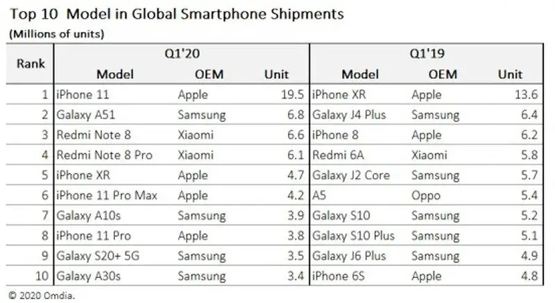 Analitycy firmy Omdia poinformowali, że najchętniej kupowany smartfonem na świecie w 1 kwartale tego roku jest iPhone 11. Autorzy raportu zwracają uwagę na to, że w czasach pandemii najpopularniejszym smartfonem został ten, które nie jest z tych najtańszych. Firma Apple według szacunków sprzedała w tym okresie prawie 19,5 milionów iPhone’ów 11. Jusy Hong, dyrektor ds. badań rynku smartfonów twierdzi, że w ciągu ostatnich 5 lat iPhone zajmuje w ich analizach 1 albo 2 miejsce. Według niego wszystko to dzięki temu, że firma Apple oferuje tylko kilka modeli iPhone’ów. Drugie miejsce zajął Samsung Galaxy A51. Sprzedało się go 6,8 miliona sztuk. Trzecie miejsce i czwarte zajęły Xiaomi Redmi Note 8 i Note 8 Pro. Na piątym miejscu znalazł się iPhone XR, który był najpopularniejszym smartfonem w ostatnich 3 miesiącach 2019 roku.