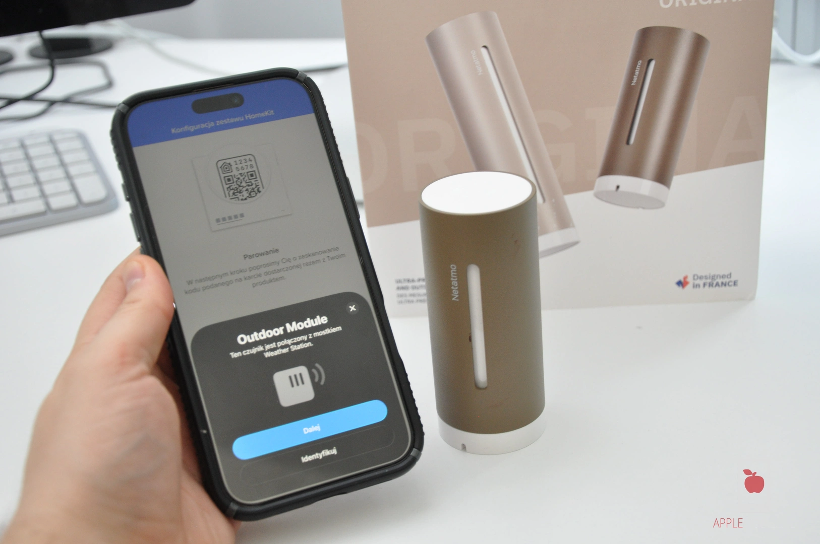 Moduł wewnętrzny należy podłączyć do prądu, a całość sparować z aplikacją Netatmo na iOS lub Androidzie. Dodanie do Apple HomeKit odbywa się przez zeskanowanie kodu QR na obudowie. Konfiguracja polega na wyborze pomieszczenia, wpisaniu hasła Wi-Fi i ustawieniu preferencji powiadomień. Proces zajmuje kilka minut.