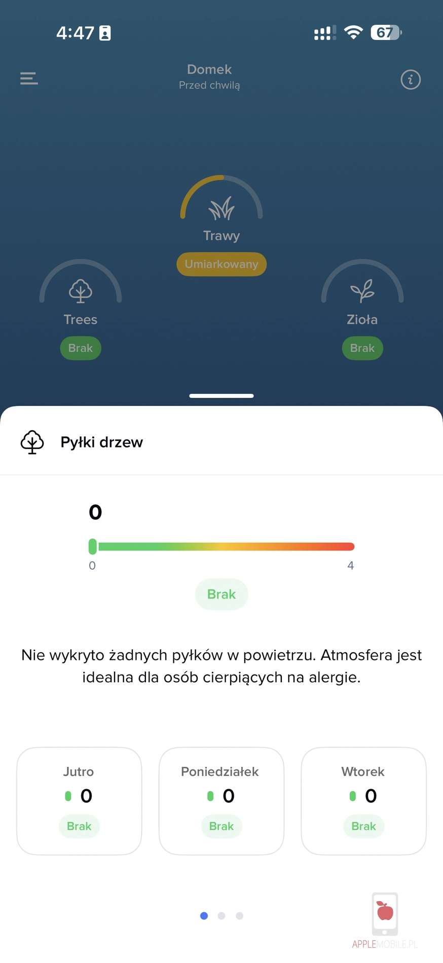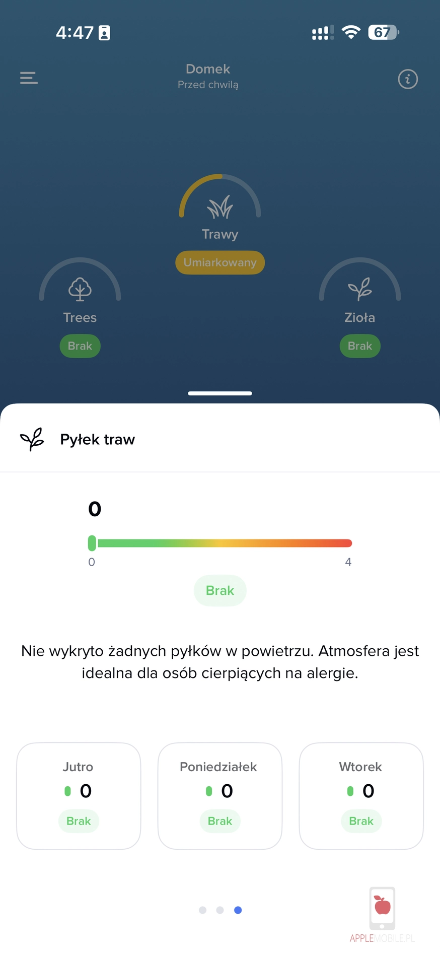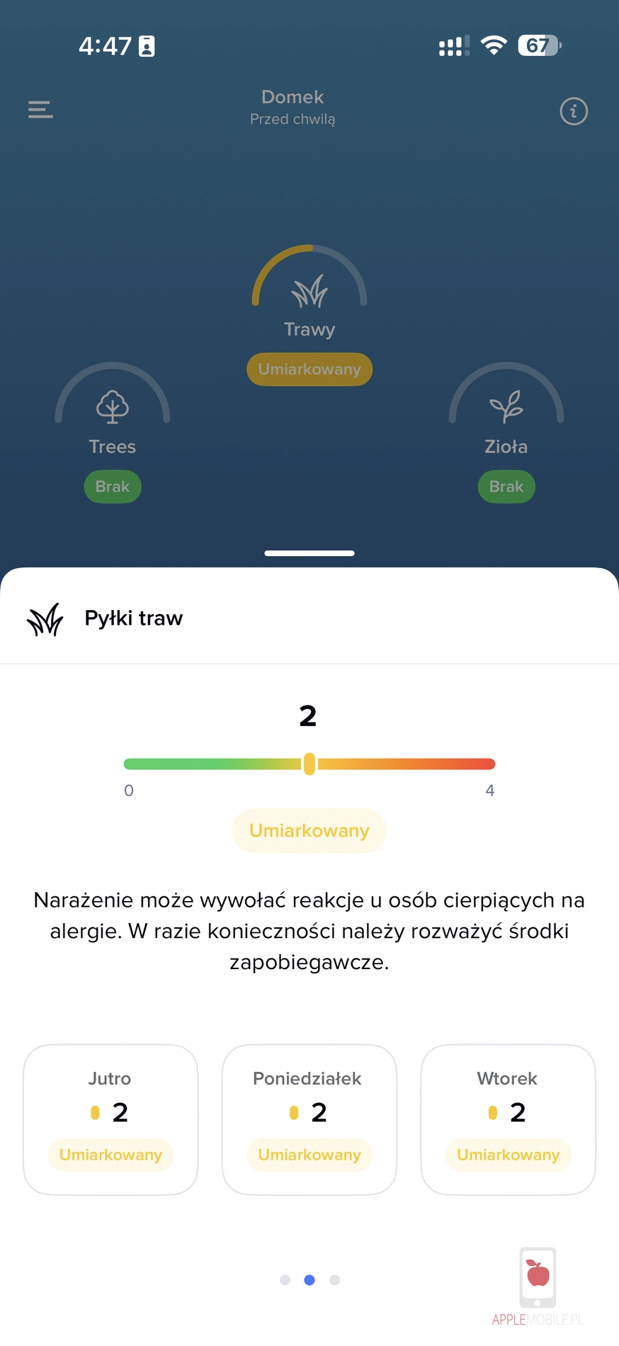Na ekranie głównym mamy wyświetlone trzy rodzaje roślin pylących, które najbardziej doskwierają alergikom. W chwili pisania tego artykułu jedynie trawy nieznacznie pylą i można to łatwo odczytać za pomocą wymownych wykresów.