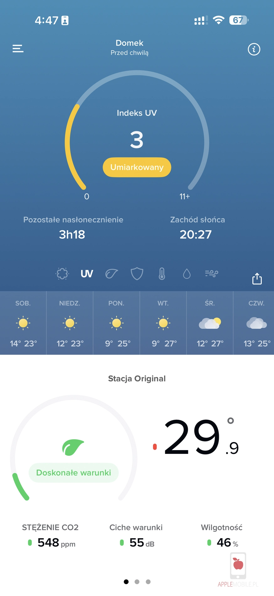 Do aplikacji Netatmo dodano odczyt i prognozy indeksu UV oraz ekspozycji słonecznej w stacji, wraz z przydatnymi alertami o ryzyku oparzeń i zaleceniami ochrony skóry przed wyjściem na zewnątrz. Po ostatnich upałach przyznam szczerze, że to przydatna funkcja, ale gdyby jej nie było, najpewniej również mogłbym bez tego żyć, albo.. sprawdziłbym to po prostu w aplikacji Pogoda na iPhonie.