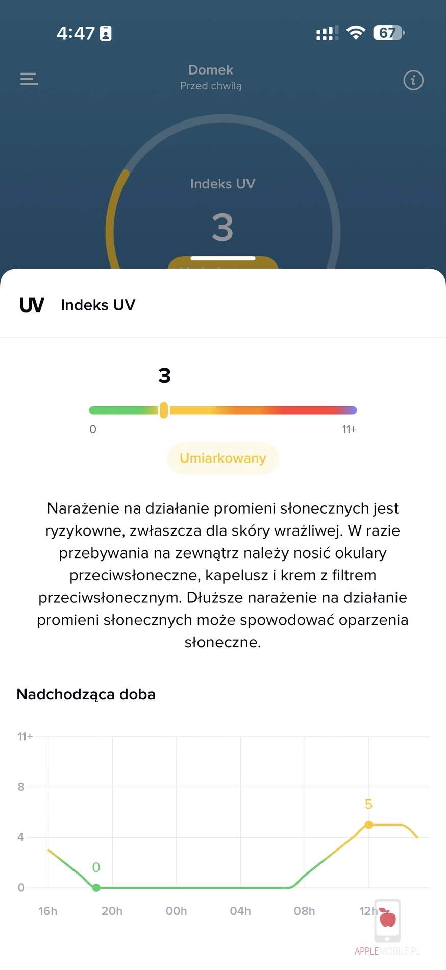 Po dotknięciu ekranu otrzymamy szczegółowe zalecenia o tym jak się ubrać, co chronić i czy chronić oraz co nam grozi, jeżeli nie zastosujemy się do tych zaleceń. Świetna sprawa! Dodatkowo na wykresie zobaczymy prognozę indeksu UV na najbliższe 24 godziny.