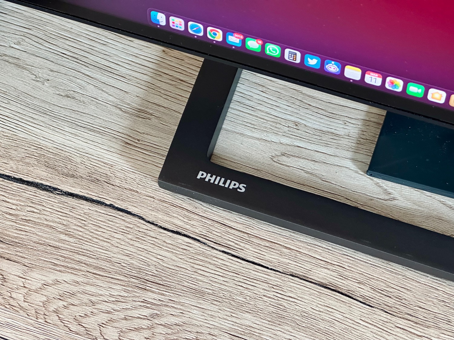 Czystość i porządek w miejscach pracy jest teraz „na topie”. Każdy stara się jak najlepiej ukrywać przewody, aby nie były one widoczne na pierwszy rzut oka. Tak zwany cable management jest z biegiem lat coraz prostszy do wykonania, ponieważ przewodów ubywa. Myślałem, że Philips tworząc całkiem minimalistyczny sprzęt, z niewielkimi ramkami, estetyczną podstawą wykonaną z aluminium i przeniesieniem loga „philips” z dolnej krawędzi ekranu na podstawę, wymyśli dobry system do poprowadzenia przewodów. Pisząc przewody mam na myśli naprawdę sporą liczbę kabli, gdyż jak wspomniałem wcześniej, monitor służy również jako hub usb, do którego podepniemy wszelakiej maści przewody, które normalnie podsielibyśmy chociażby do standardowej przejściówki na usb-c.