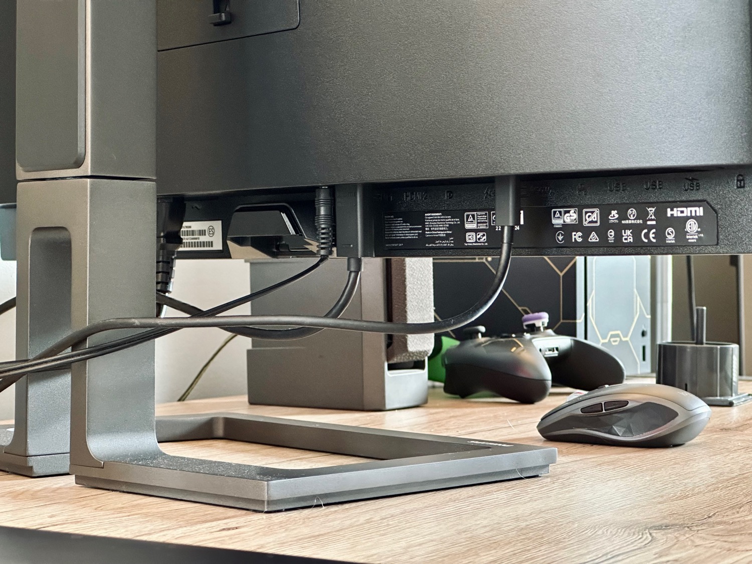 Niestety, ale w przypadku recenzowanego modelu, nie możemy liczyć na łatwość w prowadzeniu przewodów, gdyż pierwszym problemem z jakim się spotkałem to widoczność wszystkich złącz, które podpięte są do monitora – i w ten sposób dolna część ekranu zamiast raczyć nas estetycznym widokiem symetrycznych ramek, tak wita nas widokiem wszystkich przewodów, które podpięliśmy do urządzenia. Oczywiście w stopce jest wycięcie na poprowadzenie przewodów, jednak problemem tego rozwiązania jest to, że wycięcie rozpoczyna się już od samej podstawy, co generuje brak możliwości schludnego poprowadzenia kabelków.