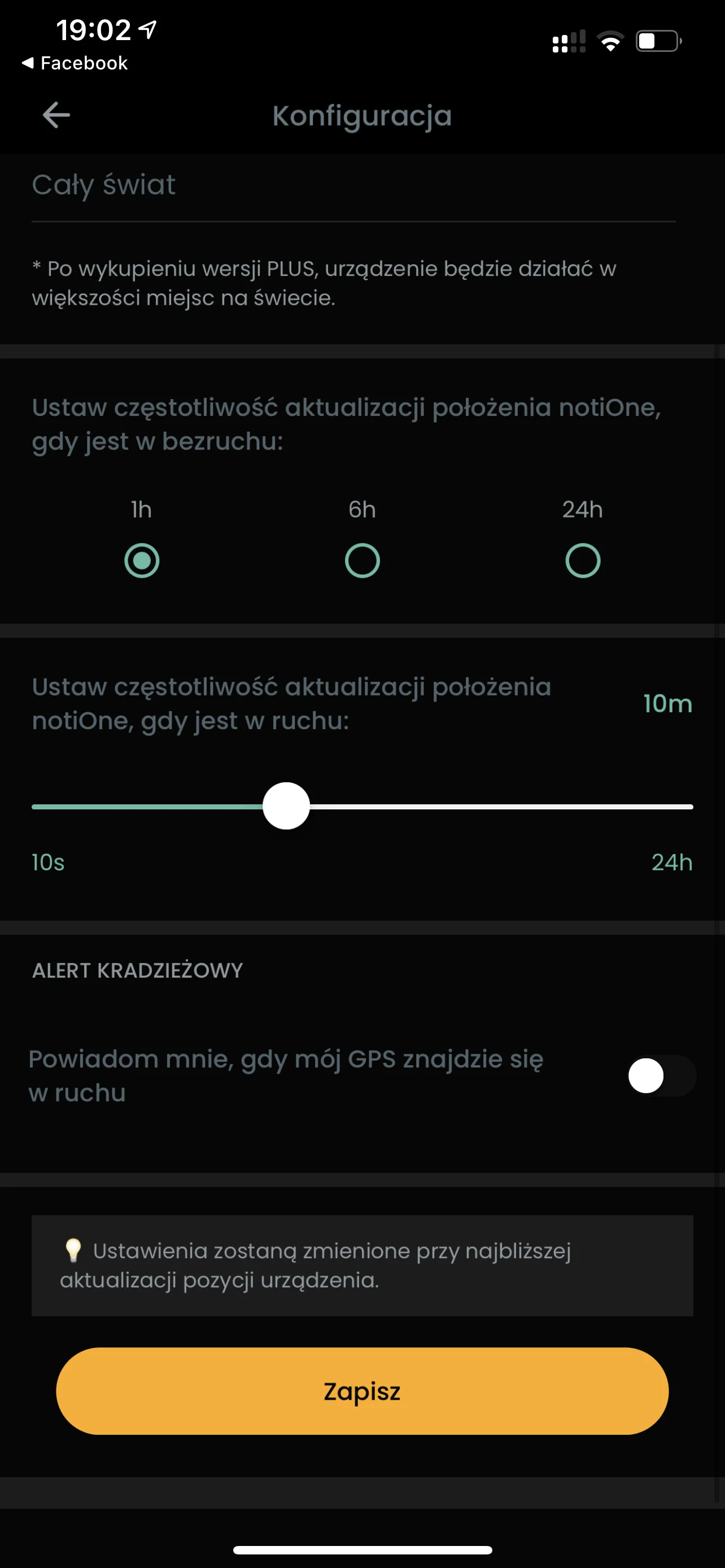 - Dostęp do konfiguracji urządzenia, który pozwala na ustawiani częstotliwości namierzania w bezruchu (1h, 6h, 24h)