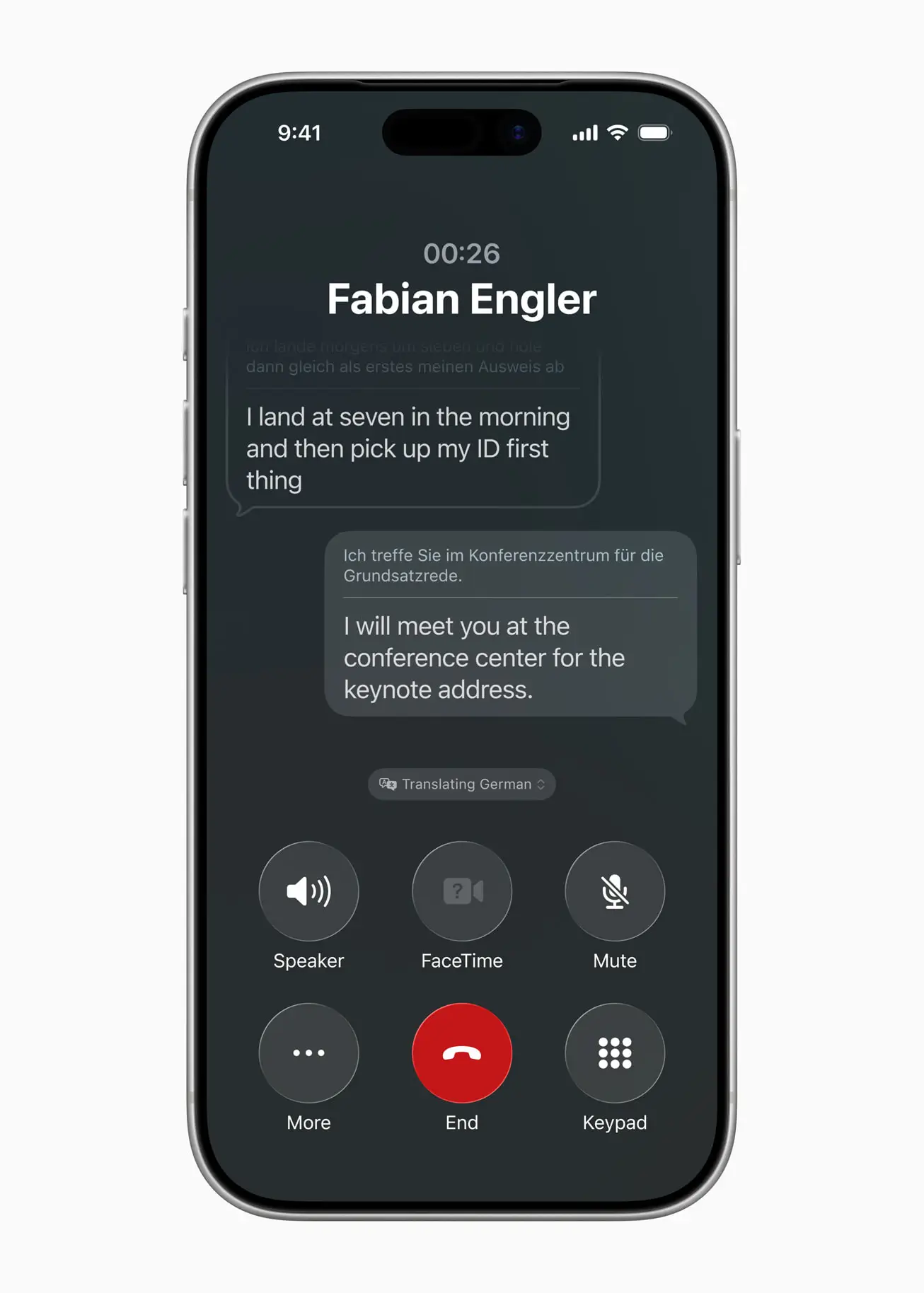 Funkcja Live Translation przychodzi użytkownikom z odsieczą podczas komunikacji w obcym języku przy wysyłaniu wiadomości lub rozmowie, gdy bariera językowa mogłaby przysporzyć im trudności komunikacyjnych. Funkcja ta jest płynnie zintegrowana z Wiadomościami, FaceTime i Telefonem.
