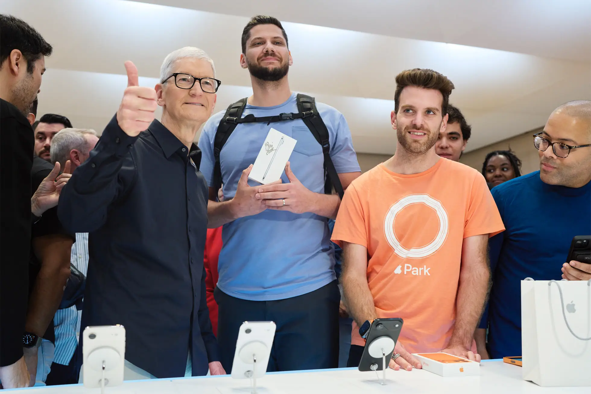 Tim Cook pozuje z klientami kupującymi nowego iPhone’a Air.