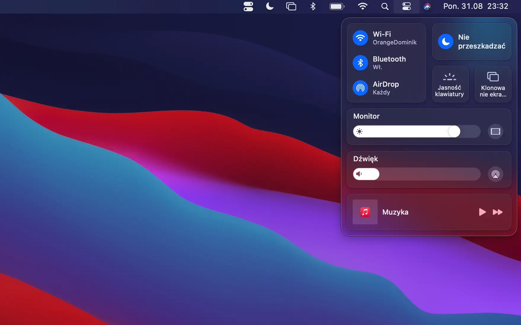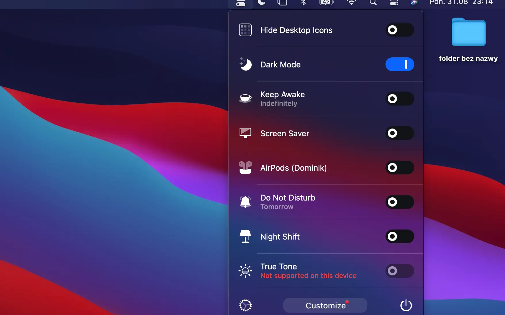 Aplikacja wyświetla się jako małe okienko na pasku w górnej części naszego pulpitu. Ikonką przypomina centrum sterowania z iPhone bądź nowe centrum sterowania z systemu macOS Big Sur. Po rozwinięciu dostajemy podstawowe opcje, znajdziemy tam chociażby dark modę, łączenie z AirPodsami, tryb Do Not Disturb, Night Shift itp.