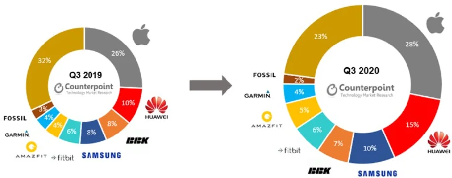 Analitycy z firmy Counterpoint Research udostępnili raport na temat rynku smart zegarków w 3 kwartale tego roku. Na pierwszym miejscu nadal jest firma Apple. Między lipcem a wrześnie uzyskała ona 28 % udział na rynku smart zegarków. Porównując do tego samego okresu w 2019 roku jest to wzrost o 2 %. Drugie miejsce zajęła firma Huawei, która uzyskała 15 % udział na rynku ze wzrostem o 5 % porównując do zeszłego roku w tym okresie. Trzecie miejsce przypadło firmie Samsung. Sprzedaż smart zegarków porównując z zeszłym rokiem wzrosła o 6 %. Całkowity przychód ze sprzedaży wszystkich smart zegarków w trzecim kwartale 2020 roku wyniósł blisko 5 miliardów $. W tym firma Apple zarobiła ponad 2,3 miliarda $. Wzrost przychodów firmy Apple to 18 % porównując z analogicznym okresem w 2019 roku.
