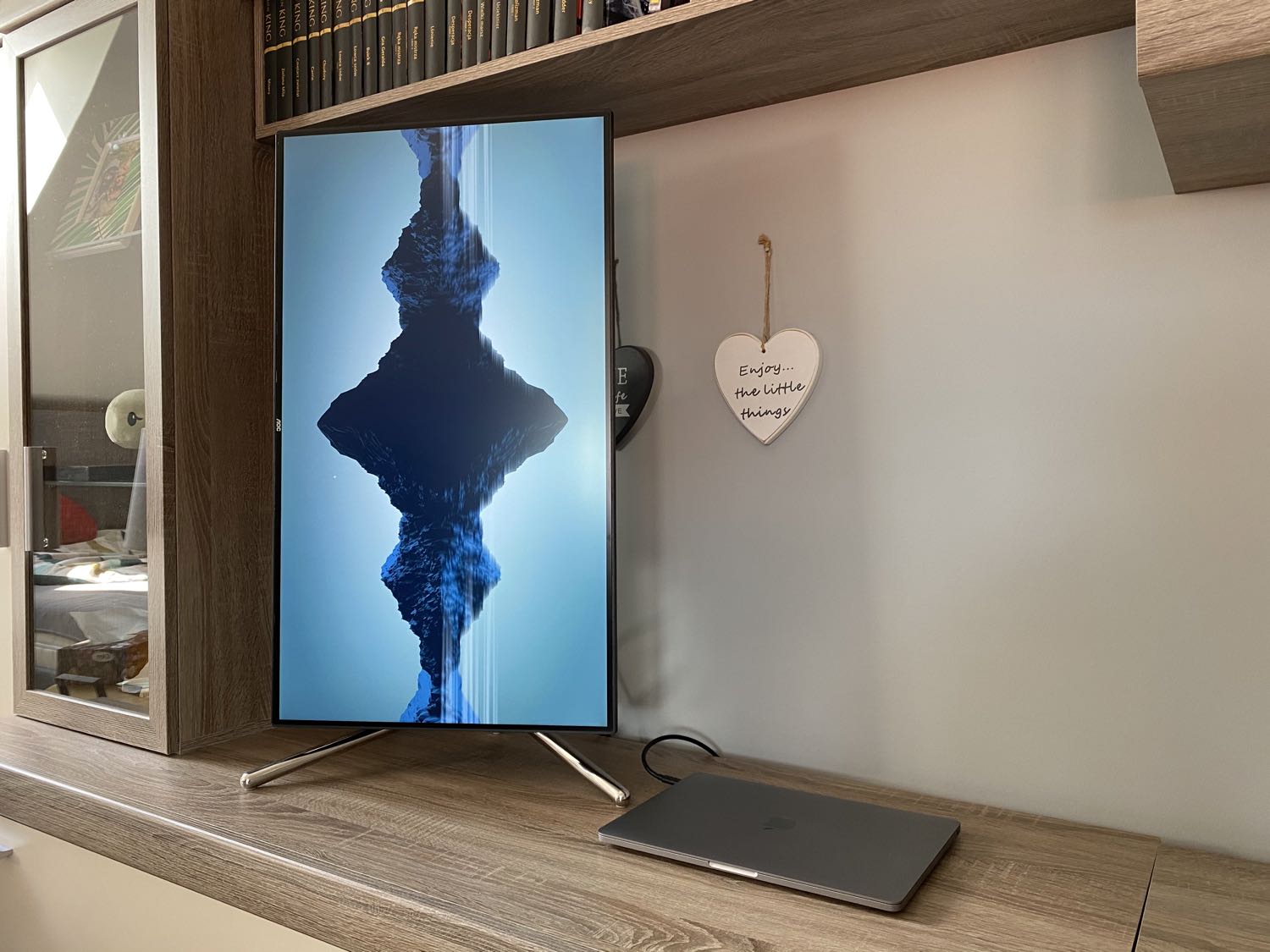 Szczególnie pojawienie się tego ostatniego spowodowało pojawienie się uśmiechu na mojej twarzy, gdyż jest to jedyny przewód, jaki potrzebuje, aby tak naprawdę w pełni cieszyć się monitorem. Dlaczego? Otóż monitor posiada wbudowany hub usb-c, a także jest w stanie bezpośrednio zasilać i ładować laptop z mocą 65 W. Takie połączenie jest zbawieniem dla wszystkich osób, które pracują i korzystają na co dzień z laptopa wyposażonego w port usb-c, jak chociażby MacBook, który posłużył mi do testów monitora.