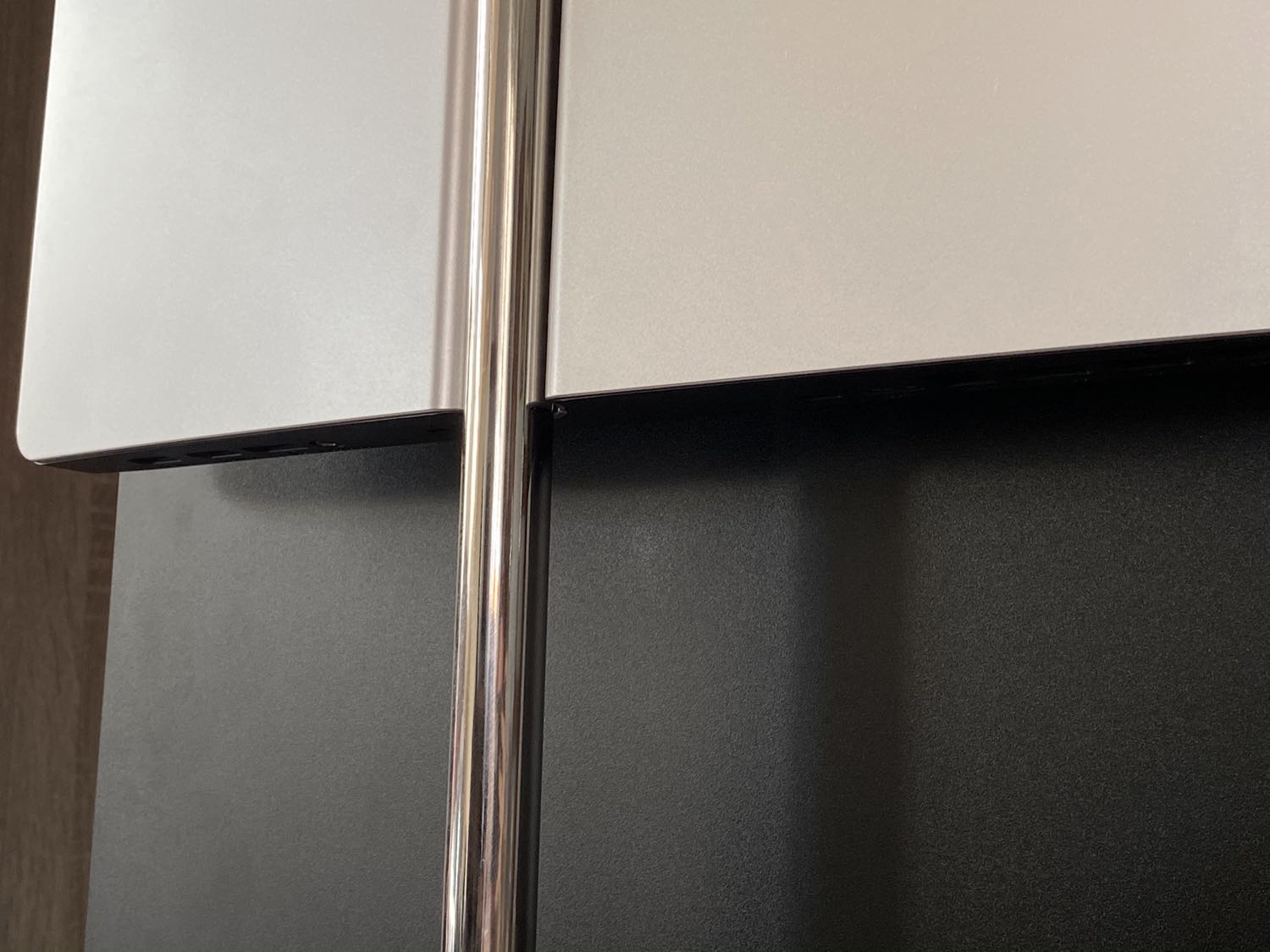 Monitor od samego początku zaskakuje swoim wykonaniem. W szczególności elementem wyróżniającym się z tłumu jest podstawka/nóżka – solidna, aluminiowa i cholernie ciężka stopka od razu wywołuje wrażenie, że mamy do czynienia ze sprzętem z wyższej półki. Podstawka płynnie przechodzi i łączy się z tylną częścią, która wygląda…oryginalnie? Myślę, że z pewnością nie widziałem nigdy czegoś podobnego. Czy mi się to podoba? Tak, na żywo wygląda znacznie lepiej niż na renderach, która można znaleźć w sieci. W tym właśnie elemencie, u jego spodu, znajdziemy wszystkie dostępne porty, które przygotował dla nas producent. Można się pokusić o delikatne pomarudzenie w tym temacie, że tylna pokrywa nie jest aluminiowa, tylko wykonana z tworzywa sztucznego.