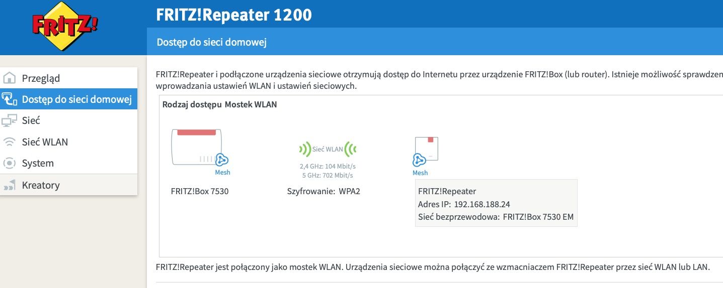 Dzięki wprowadzonej obsłudze MESH nie tylko dla repeaterów, ale także dla niektórych routerów, teraz mój 3490 stał się wzmacniaczem MESH w połączeniu z repeaterem Fritz! 1200. Taka mała sieć MESH pozwoliła na pełne pokrycie siecią WiFi w mieszkaniu, mimo rozległego rozkładu i ścian. Wymiana poprzedniego routera z górnej półki na elementy od Fritz! zakończyło moje problemy z koniecznością restartowania routera dla zapewnienia dostępu do sieci.
