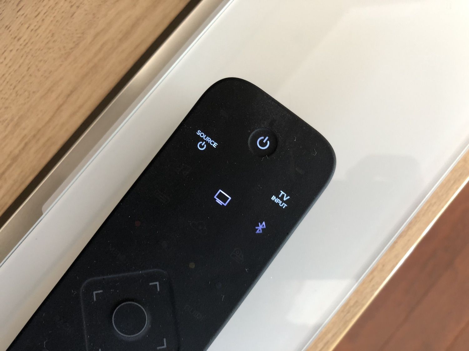 Pilot po wzięciu do ręki jest naprawdę ciężki, w końcu w jego wnętrzu skrywają się aż cztery baterie. Tym, czym najbardziej wyróżnia się ten pilot to podświetlane klawisze. Uruchamiają się dopiero w momencie jak pilot podniesiemy – wyposażono go w czujnik ruchu. Pilot podświetla w danym momencie tylko te opcję, z których możemy aktualnie skorzystać. W momencie używania telewizora mamy funkcję, które użyjemy w trakcie oglądania telewizji. Natomiast, gdy przełączymy źródło chociażby na bluetooth, to na pilocie zostają podświetlone stosowne do tego opcję. Proste i intuicyjne. Gumowany materiał, którym pokryty jest pilot ma jednak niestety jedną, poważną wadę – łatwo zbiera zanieczyszczenia.