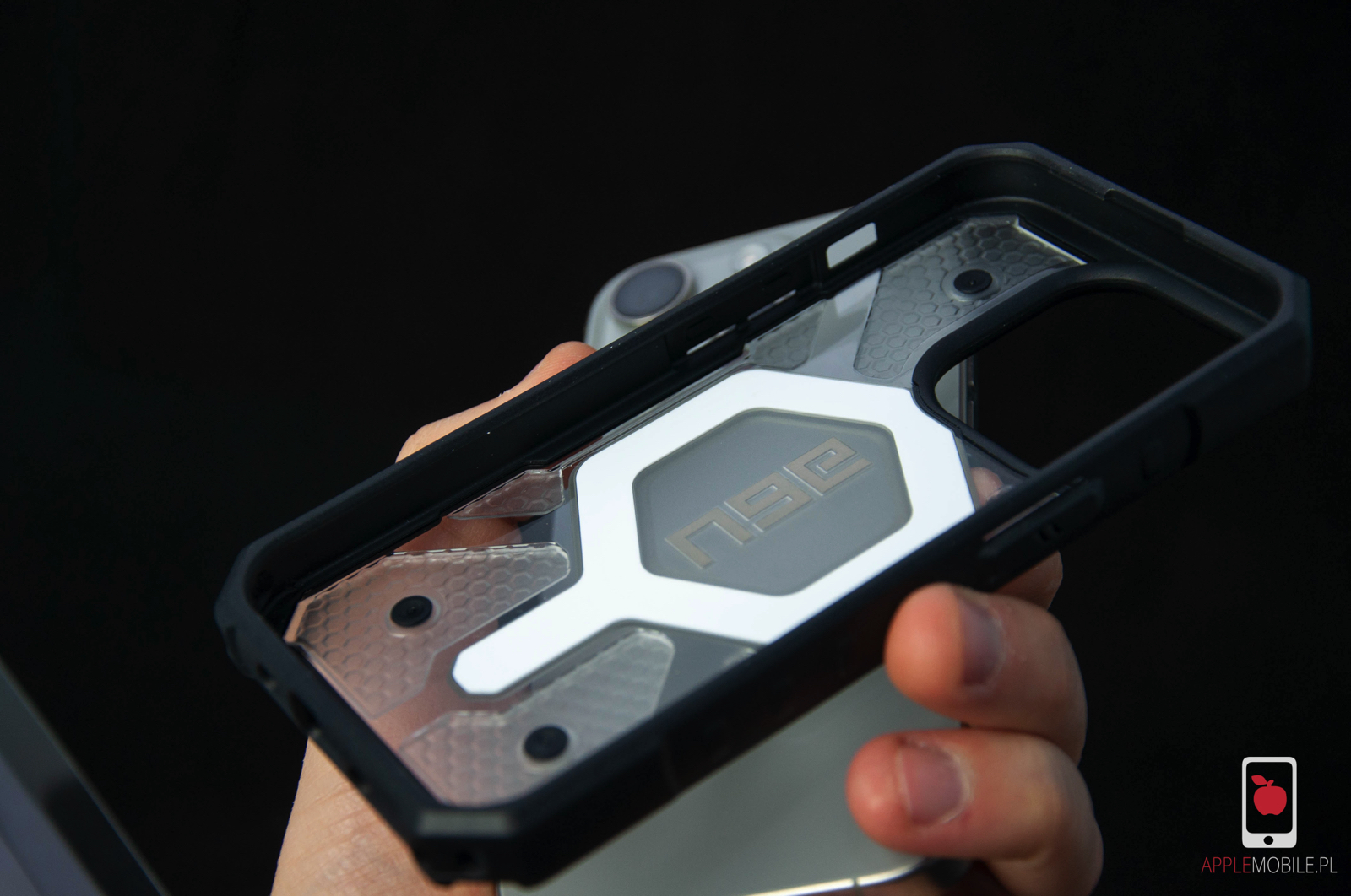 Choć na pierwszy rzut oka tego nie widać, to etui Urban Armor Gear Patchfinder dla iPhone 15 Pro jest wyposażone w pierścień MagSafe.