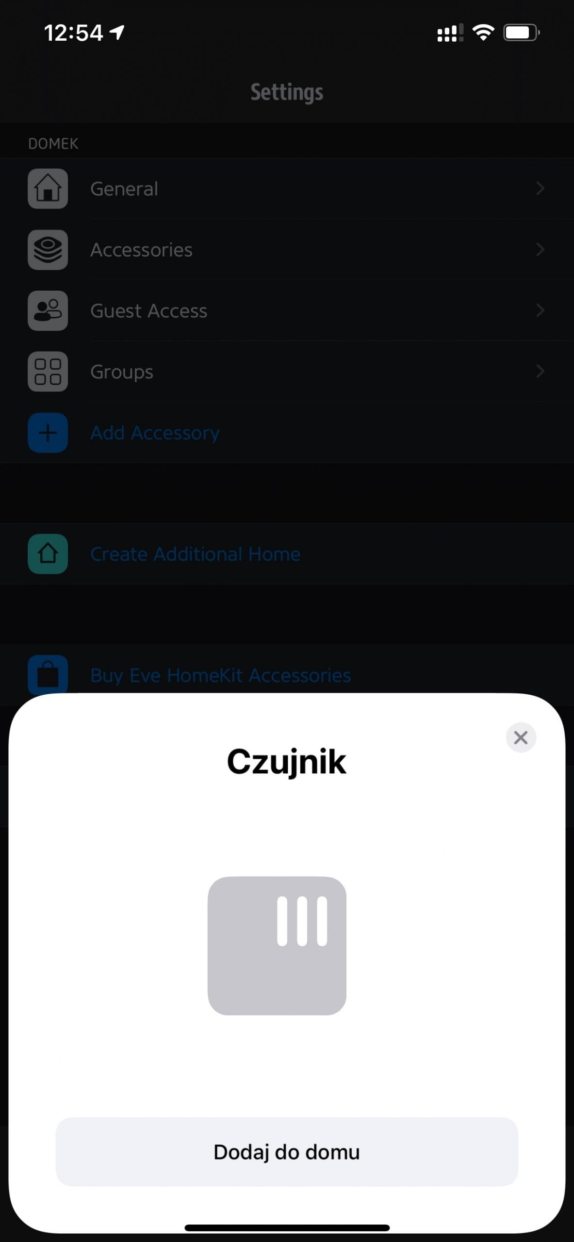 Po uruchomieniu aplikacji z dolnej belki menu wybieramy zębatkę, czyli Settings, a następnie funkcję Add Accessory, która pozwala dodawać nowe elementy instalacji.