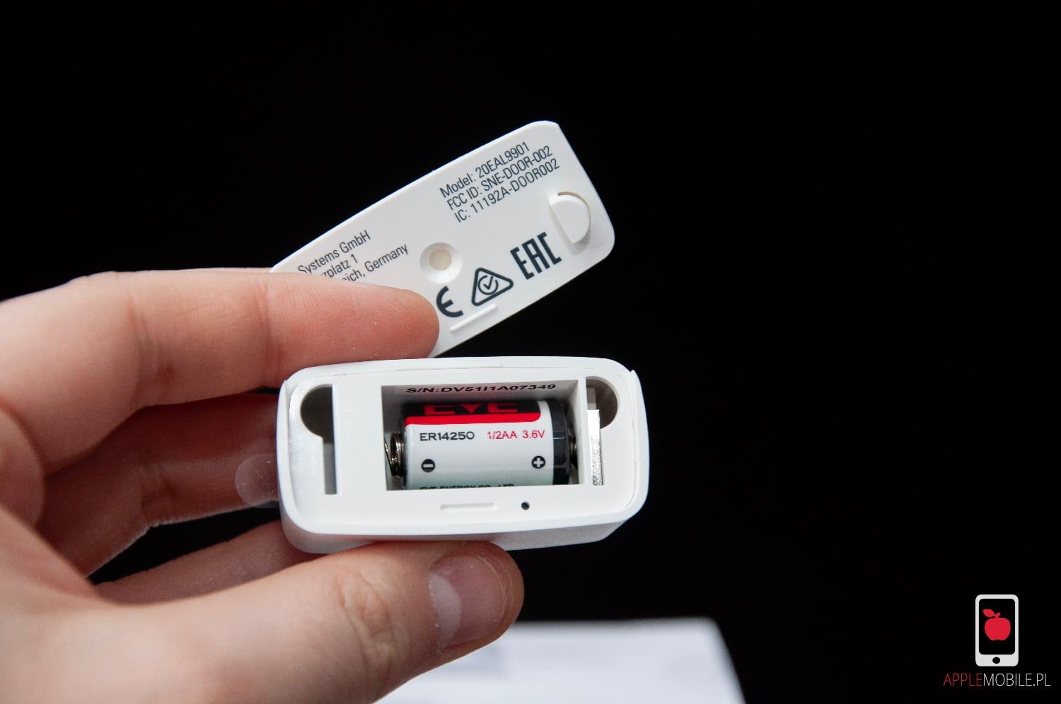 W zestawie znajdziemy więc urządzenie EVE kontaktron oraz element magnetyczny do niego, baterię ER14250, która powinna wystarczyć co najmniej na rok pracy, a także podkładki do montażu na drzwiach lub oknie elementu magnetycznego oraz klapkę z taśmą montażową.