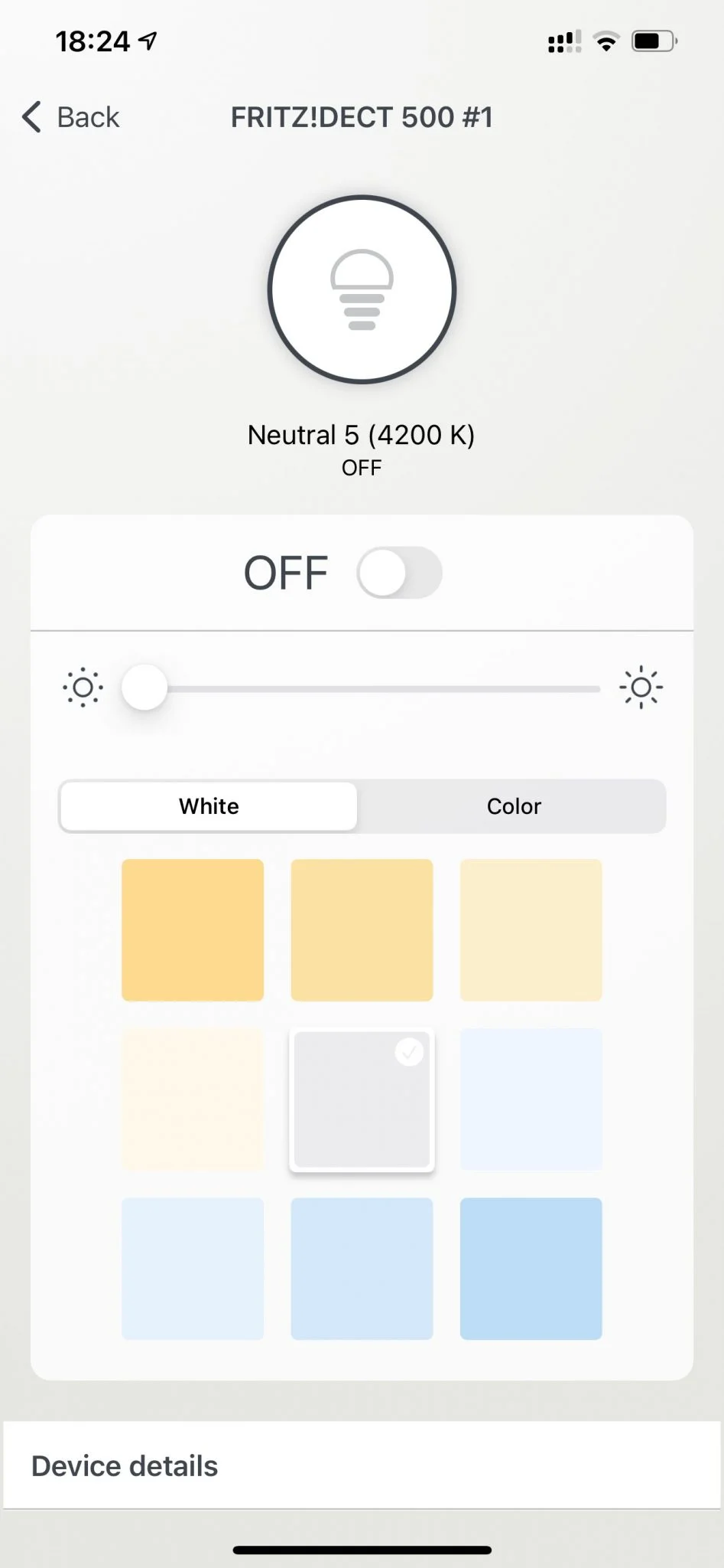 W przypadku światła białego również możemy wybrać jego temperaturę barwową z poziomu kafelków odpowiadających konkretnym barwom. Producent zapewnił również możliwość płynnej zmiany intensywności świecenia żarówki za pomocą suwaka.