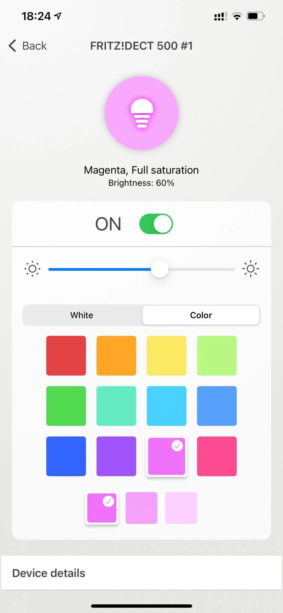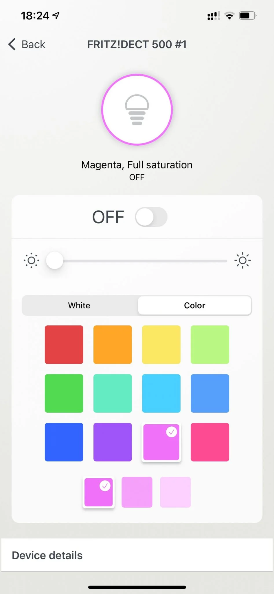 Zapalanie i gaszenie żarówki jest oczywiście możliwe z poziomu klawisza ściennego naszej instalacji elektrycznej. Natomiast zarządzanie kolorem, temperaturą barwy białego światła czy też intensywnością, możliwe jest z poziomu panelu przeglądarki komputera w panelu administracyjnym routera albo z poziomu aplikacji na iPhone’a Fritz! Smart Home.