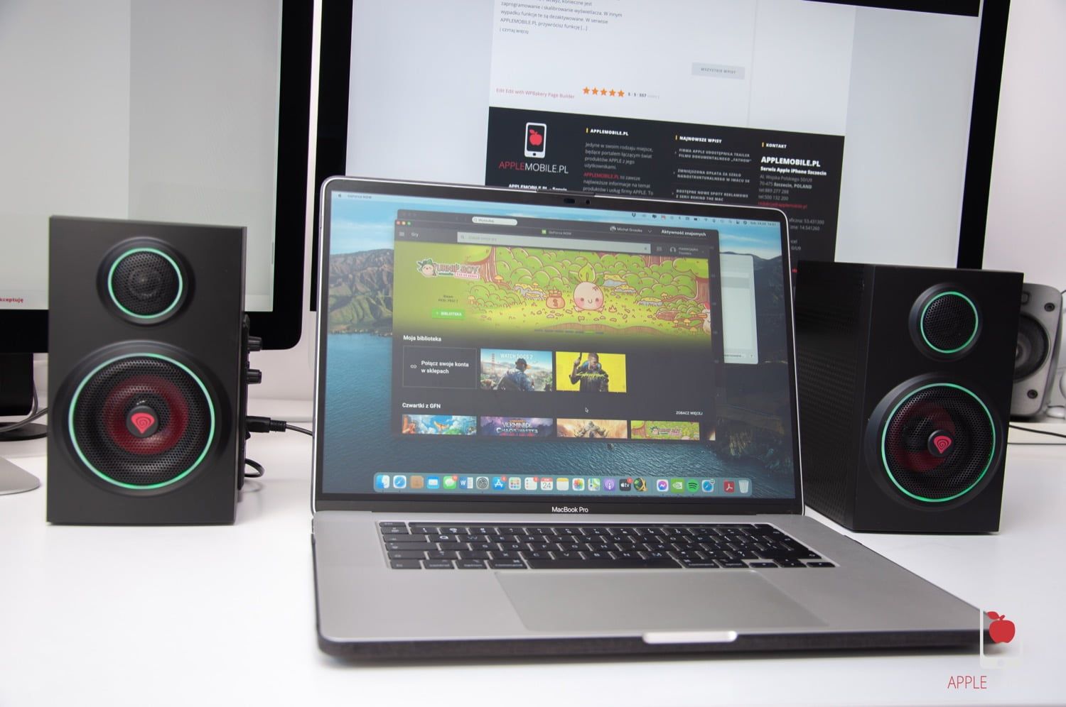 Jesteśmy na APPLEMOBILE.PL wiec musimy zacząć od kompatybilności z komputerami Apple. Tu oczywiście możemy z powodzeniem skorzystać z łączności bezprzewodowej Bluetooth, jak również przewodowej za pomocą kabla dołączonego do zestawu, zakończonego wtykiem JACK 3.5mm. Niestety nie wykorzystamy w żaden sposób funkcji ARGB, ponieważ do tego konieczne jest posiadanie odpowiedniej płyty głównej wspierającej ARGB. Gdy taką posiadamy, możemy sparować głośniki za pomocą systemów Polychrome RGB, Mystic Light Sync, RGB Fusion oraz AuraSync. Jeżeli zamierzamy korzystać z głośników przy komputerze niewspierającym ARGB, to oczywiście podświetlenie ich nadal będzie działać w trybach fabrycznych, jednak o synchronizacji głośników z innymi akcesoriami możemy co najwyżej pomarzyć.