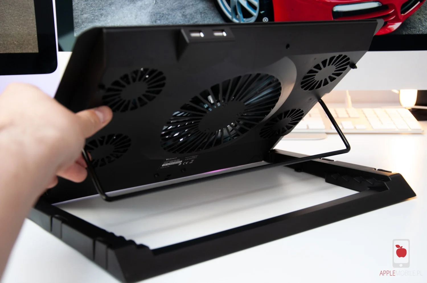 Podkładka oferuje kilka możliwości kąta nachylenia, dzięki czemu możemy wygodnie pisać na klawiaturze będącej na wyposażeniu komputera, jak również unieść ekran i korzystać z komputera jak z monitora z podłączoną zewnętrzną klawiatura i myszą. To pozwoli na zdecydowanie większą ergonomię pracy. Dodatkowy port USB można wykorzystać właśnie na podpięcie zewnętrznej klawiatury. W końcu jeden port komputera zajmujemy zasilaniem podkładki. Szkoda byłoby marnować kolejny.