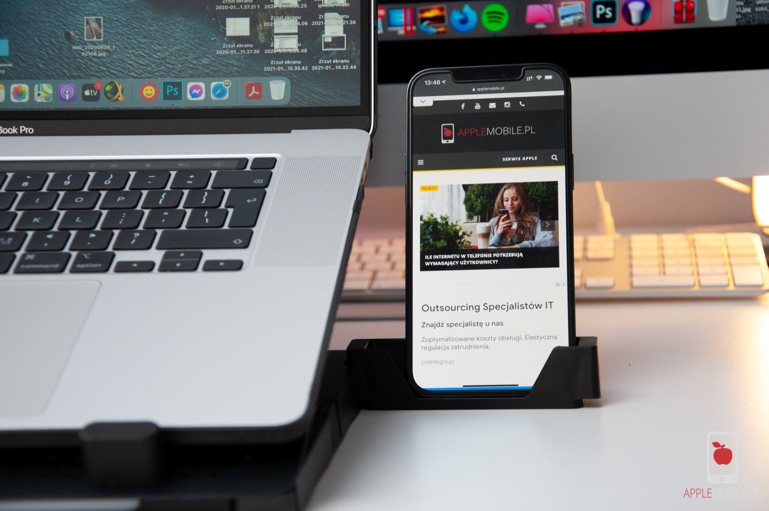 Dodatkowo zestawie znalazło się miejsce na podstawkę dla telefonu. Możemy ją zainstalować po lewej lub po prawej strony podstawki chłodzącej, w zależności od tego jak nam bardziej pasuje. Trzeba przyznać, że uchwyt jest bardzo szeroki i pomieści nawet największe smartfony. Mimo, że mój iPhone 12 Pro Max jest bardzo dużym telefonem, to i tak w podstawce jest jeszcze sporo miejsca i z powodzeniem można by wsadzić tu dużo szerszy smartfon.