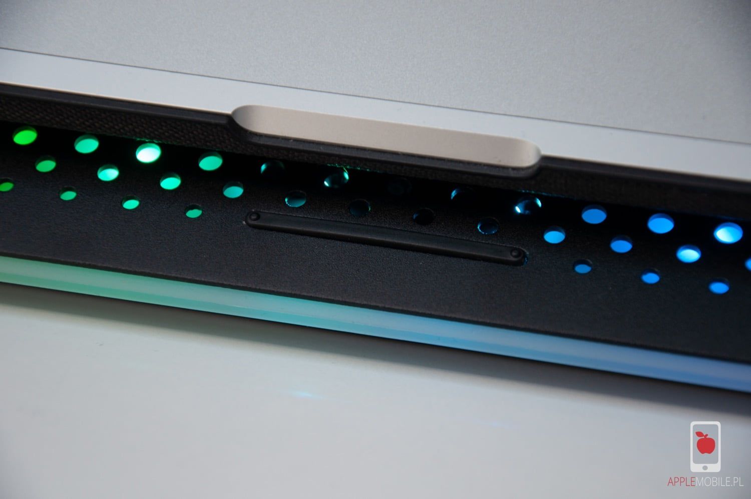 Dodatkowo umieszczono mleczny panel przy dolnej krawędzi. Wystarczy nacisnąć przycisk po lewej stronie, aby uruchomić jego podświetlenie w kolorach tęczy.