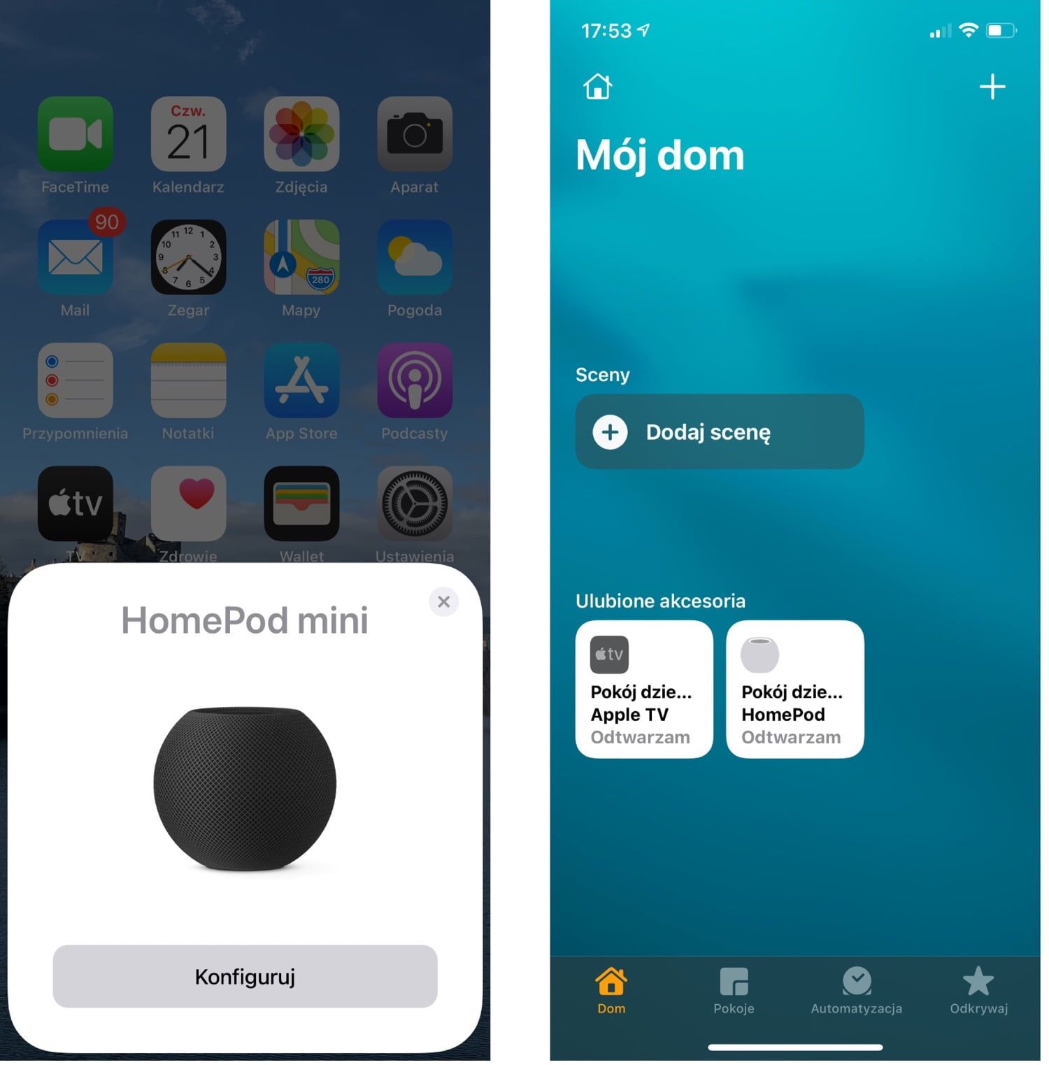 Połączenie HomePoda Mini wymaga tylko przyłożenia do niego telefonu na kilka sekund i… tyle. HomePod Mini jako dodatkowe urządzenie pojawia się nam w aplikacji HomeKit, co wynika z tego, że za jego pośrednictwem możemy sterować innymi urządzeniami zgodnymi z HomeKit.