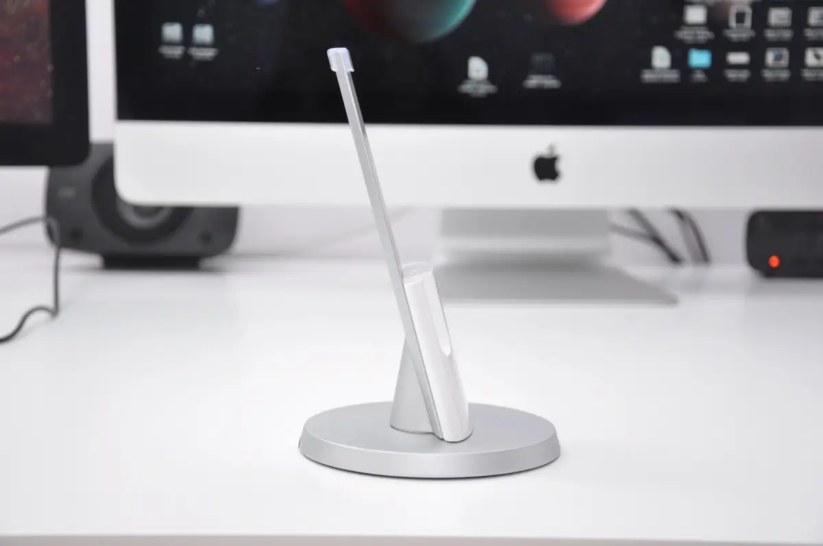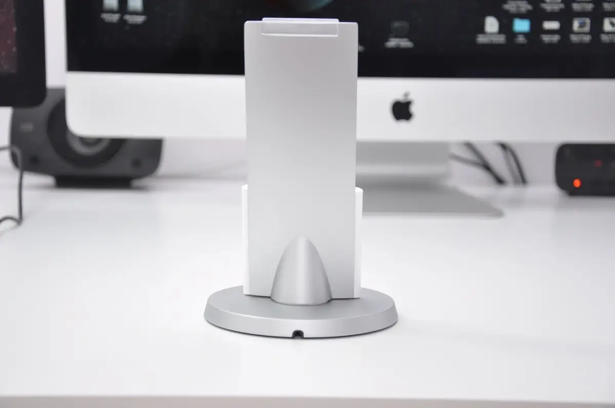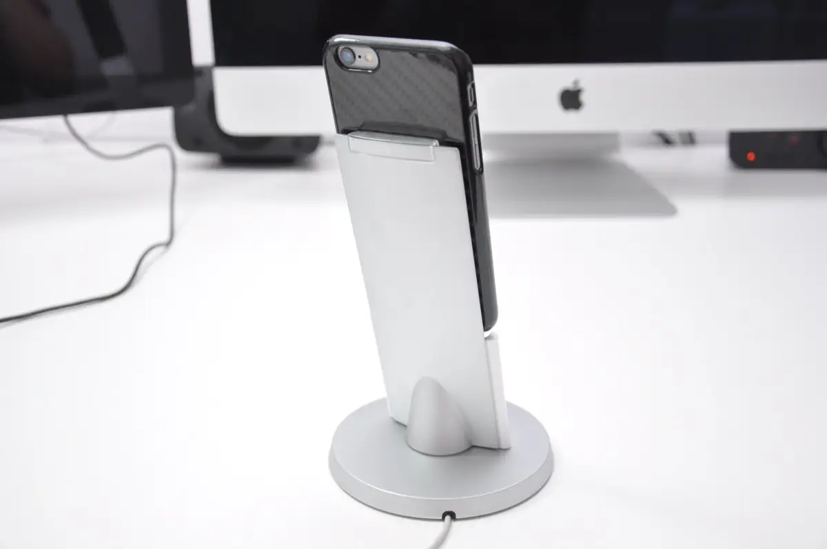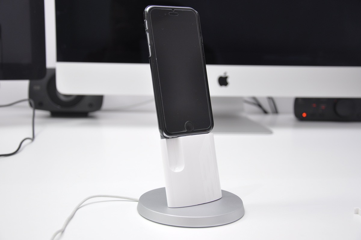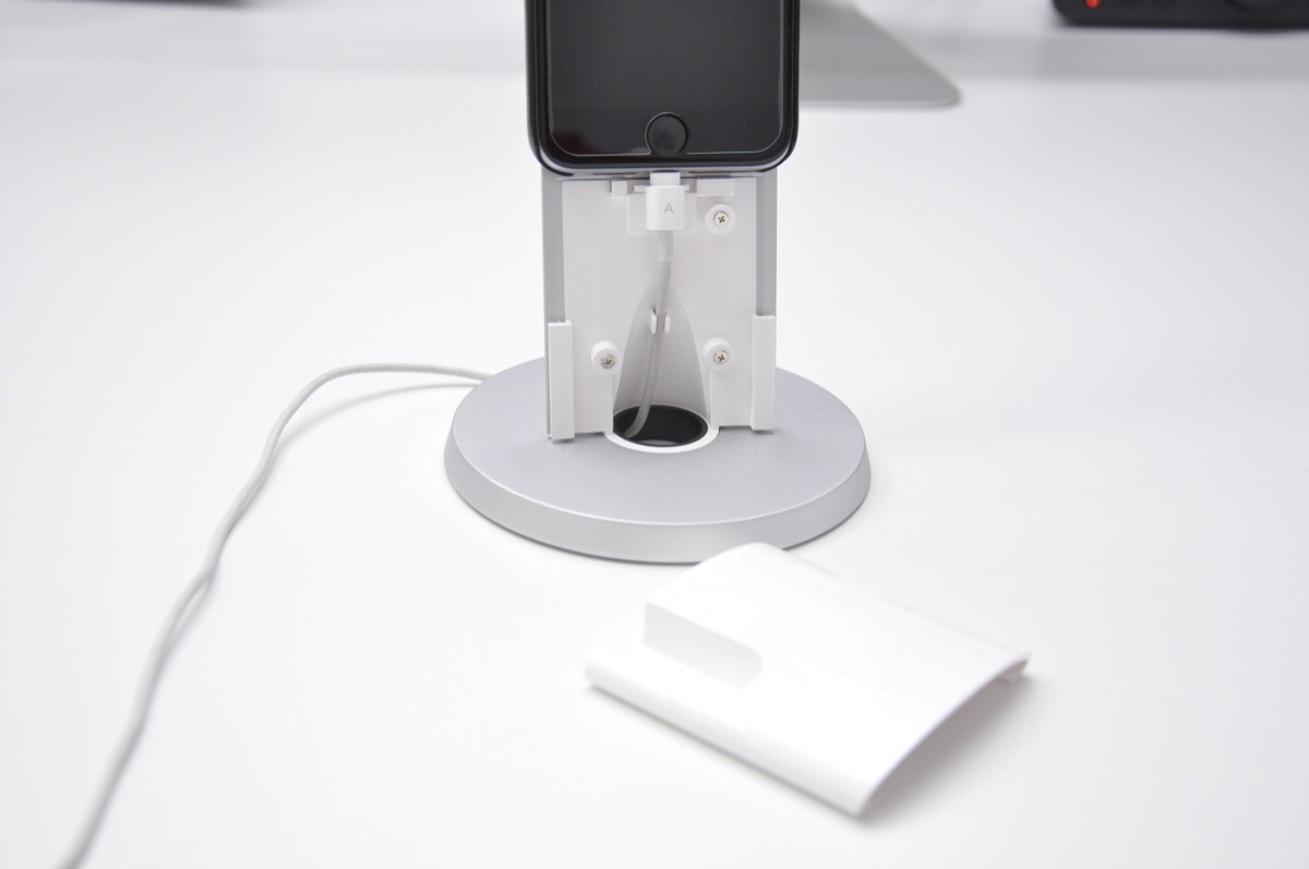 Brak ramek wokół podpórki pozwala za zamocowanie dowolnego urządzenia ze złączem Lightening, nawet pilota od APPLE TV 4G. Dodatkowo umożliwia to ładowanie telefonu, który znajduje się w niemal dowolnym etui, także tym z grubą ścianką w dolnej podstawie smartfonu.
