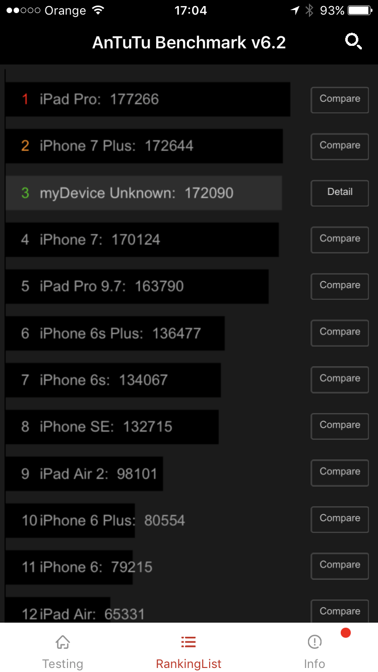W aplikacji testującej wydajność smartfonu AnTuTu testowany telefon uzyskał 172090 punktów. Jest więc znacznie mocniejszy od lidera stawki, którym do tej pory był iPhone 6S Plus uzyskując wynik 132620 punktów. Jednak sam procesor zastosowany w iPhone 7 nie jest najmocniejszą jednostką dostępną na rynku, gdyż zabrakło mu około 5 tysięcy punktów by przebić procesor Qualcomm 820. Jest natomiast mocniejszy od procesora A9 o około 10tysięcy punktów. Z rankingu produktów Apple wynika, że uzyskane wartości iPhone’a 7 stawiają go na 3 pozycji pod względem wydajności. Lepszy okazał się jedynie iPhone 7 Plus. Najlepszy jest natomiast iPad Pro. Pod względem wydajności rzeczywiście iPhone 7 to Ferrari wśród smartfonów.